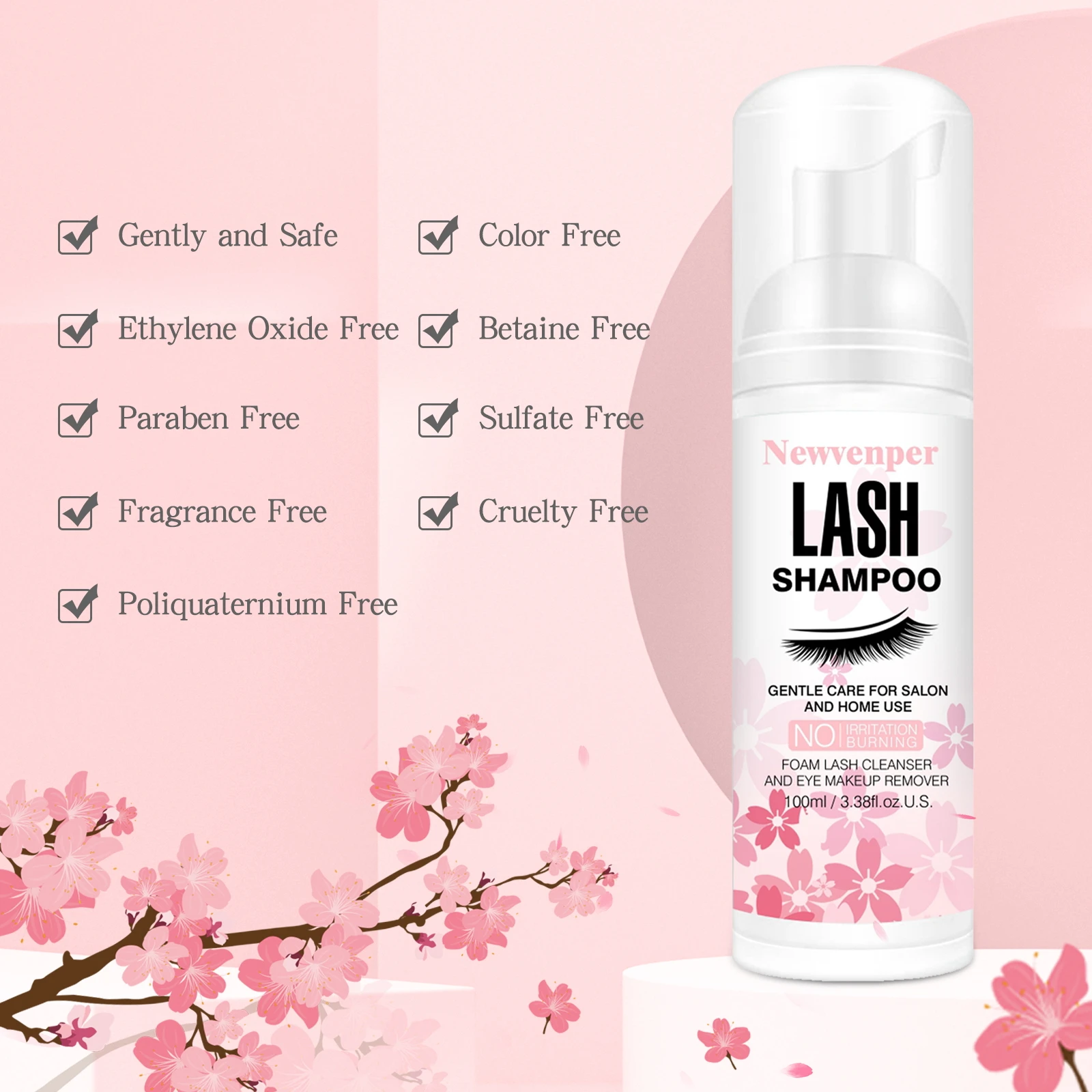 Experience gentle and effective eyelash cleansing with this 100ml foaming lash shampoo, designed for eye makeup removal and extension care. The minimalist white cylindrical bottle features delicate pink floral accents and an elegant eyelash illustration, creating a feminine and calming aesthetic. Included are a sleek mascara wand with a densely bristled brush and a lightweight pink-handled applicator, perfect for precise cleaning. Free from high-concerned chemicals, this unisex eye serum offers moisturizing, irritation-free care for salon or personal use. Manufactured in March 2023 with a 5-year shelf life, this combo pack ensures a sophisticated, safe, and effective lash cleansing experience every time.