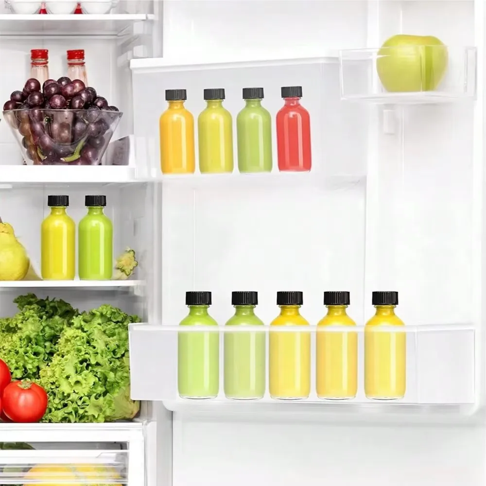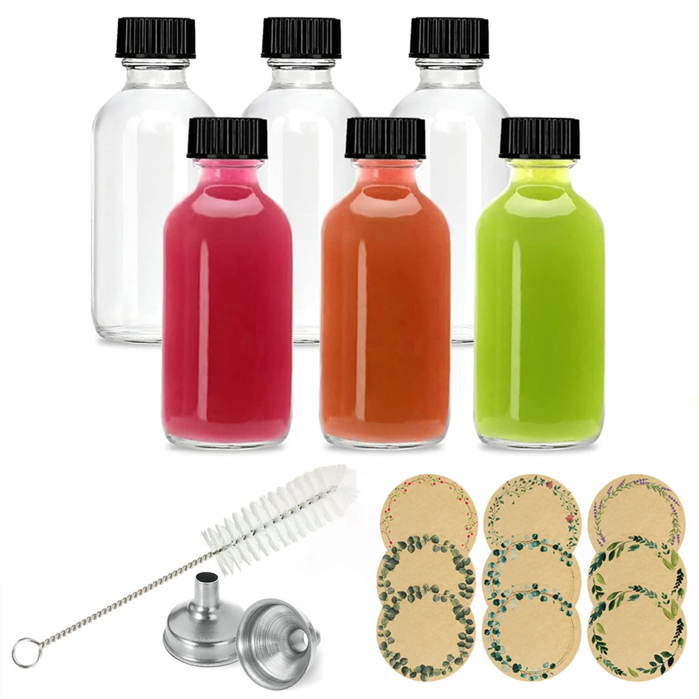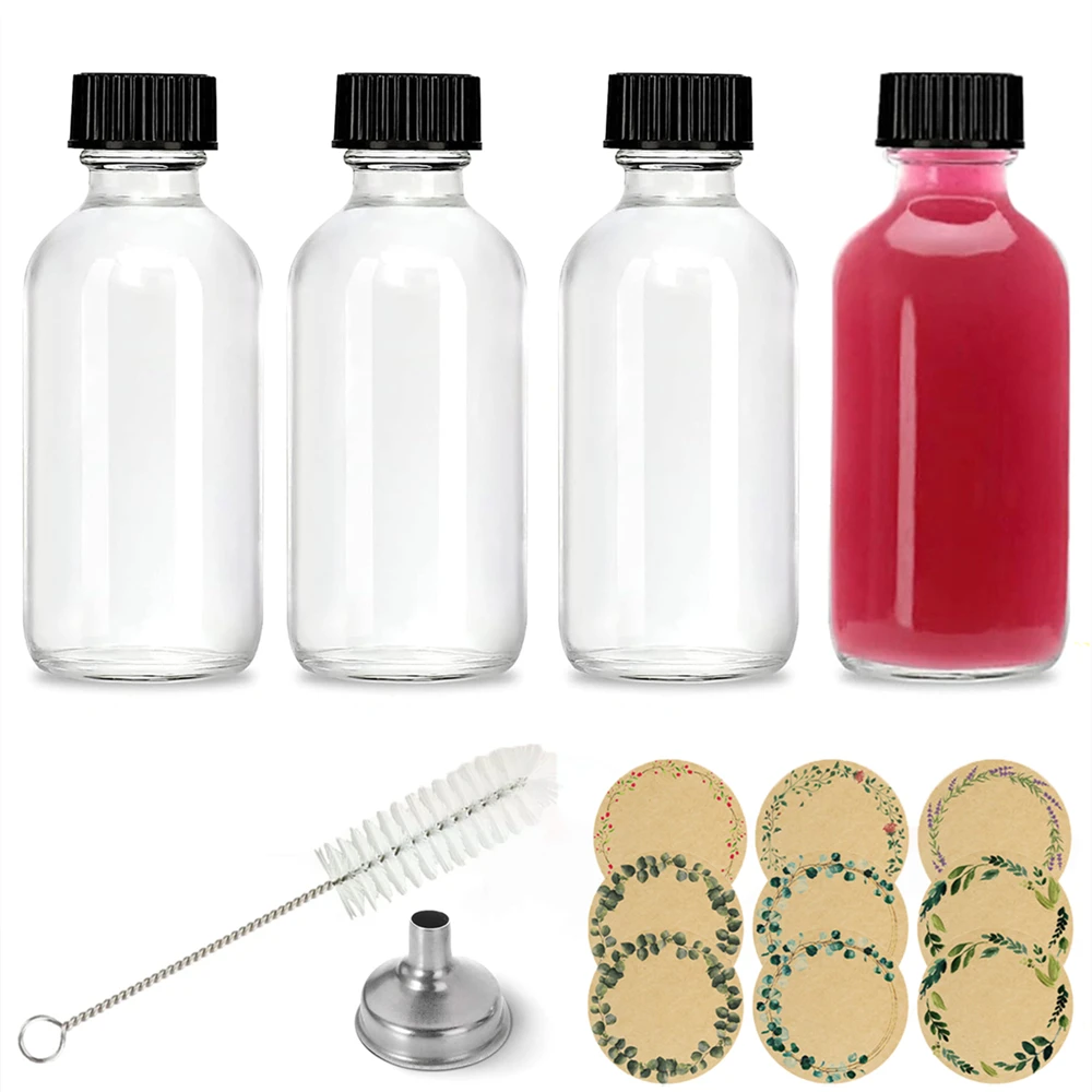 These 2 oz (60 ml) clear glass bottles with black screw-on lids are perfect for liquids like juices, oils, potions, whiskey, and more. Made from BPA-free, lead-free, eco-friendly thick glass, they are reusable, dishwasher safe, and feature leak-proof, airtight conical caps for secure travel. Each set includes stainless steel funnels for easy filling, 12 decorative labels for organization, and a cleaning brush for effortless maintenance. Designed for outdoor, travel, and sports use, the transparent style allows easy monitoring of contents, and their compact size ensures convenience on the go for adult enthusiasts and collectors.