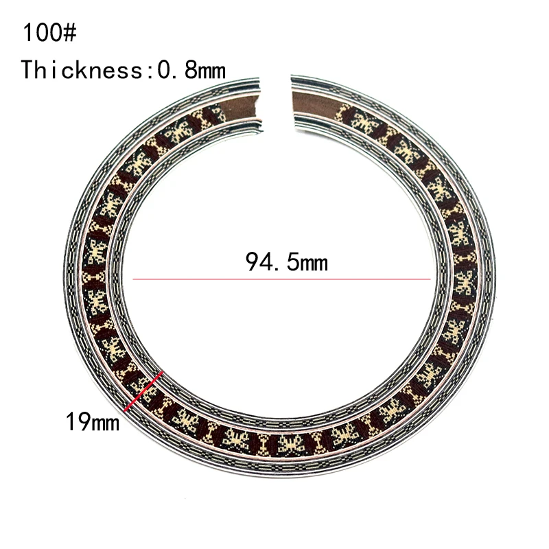 Enhance the aesthetic of your classical guitar with this set of three wooden sound hole inlays, style “3pcs YKQ100.” Each inlay features a 94.5mm diameter, a 19mm decorative circle width, and a 0.8mm thin profile, designed for inset installation without glue. The intricate, symmetrical patterns combine geometric and stylized motifs in contrasting black and beige tones, providing a sophisticated and elegant look. With a polished, smooth outer edge and high-quality craftsmanship, these inlays add a subtle, ornate detail to your instrument, elevating its visual appeal while ensuring durability and seamless integration into your guitar’s sound hole.