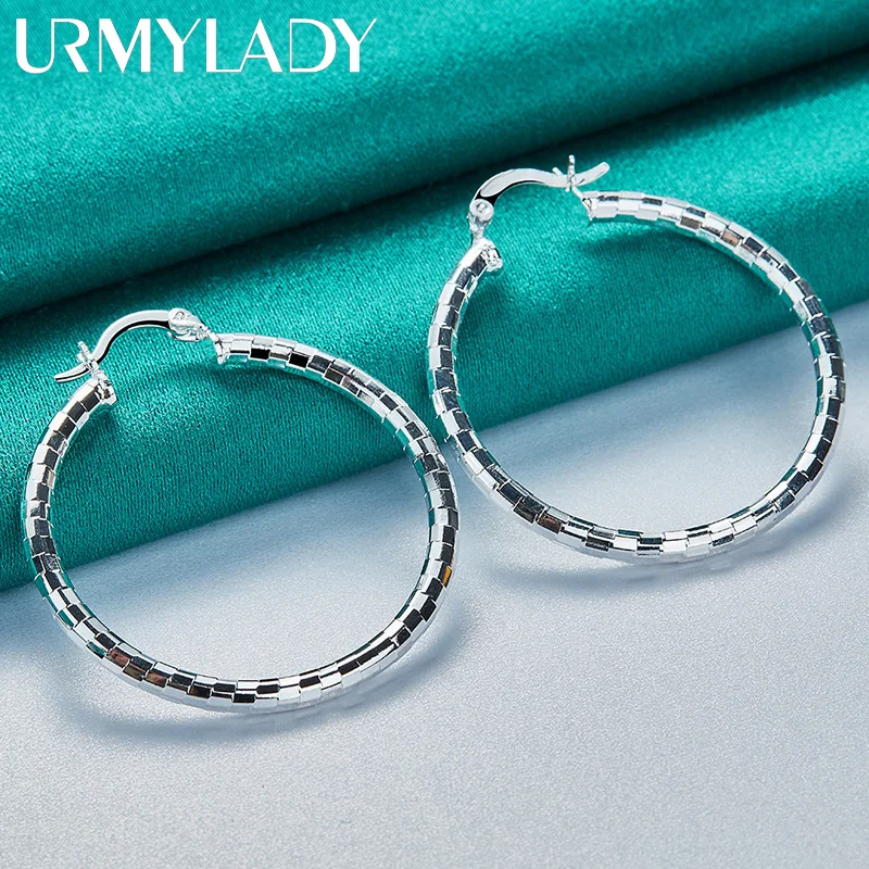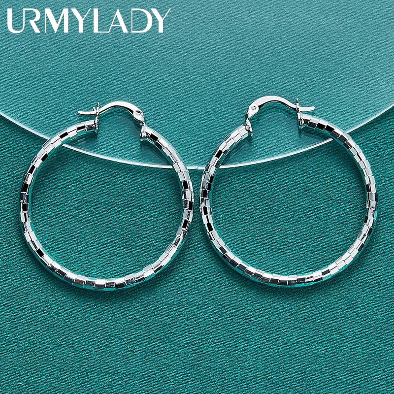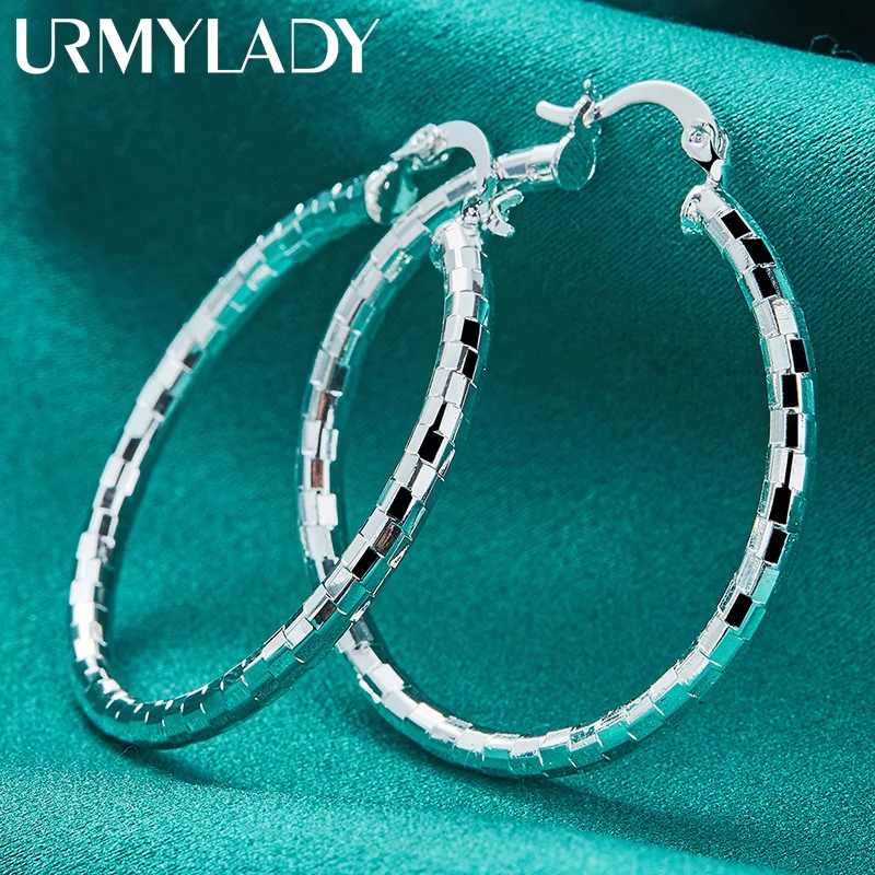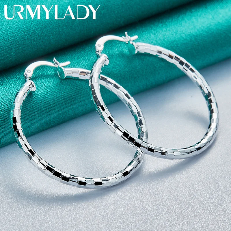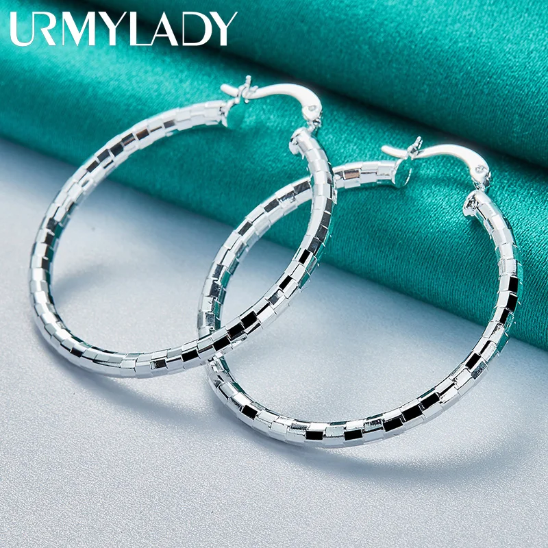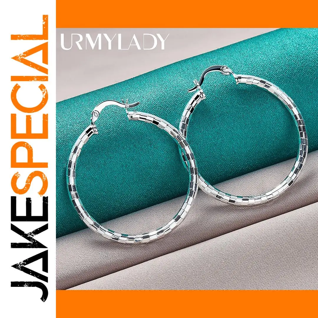 Experience timeless elegance with these 40mm diameter hoop earrings crafted from genuine 925 Sterling Silver, stamped for authenticity. Designed for women, their sleek, mirror-face circular design features a modern geometric pattern of rectangular segments that reflect light beautifully, creating a luminous effect. Weighing only about 5 grams, these lightweight earrings combine comfort with sophisticated style, making them perfect for weddings, engagements, or everyday fashion. The minimalistic yet eye-catching design emphasizes clean lines and polished surfaces, ensuring a luxurious appearance for any occasion. Certified for quality, these classic hoops offer a refined finishing touch to your jewelry collection.