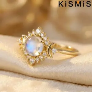 - Surrounding the main stone is a halo of small sparkling round gemstones, enhancing brilliance and drawing attention to the central moonstone beautifully.