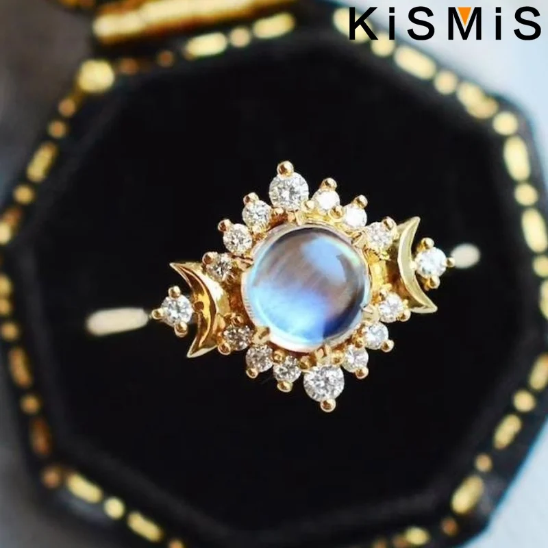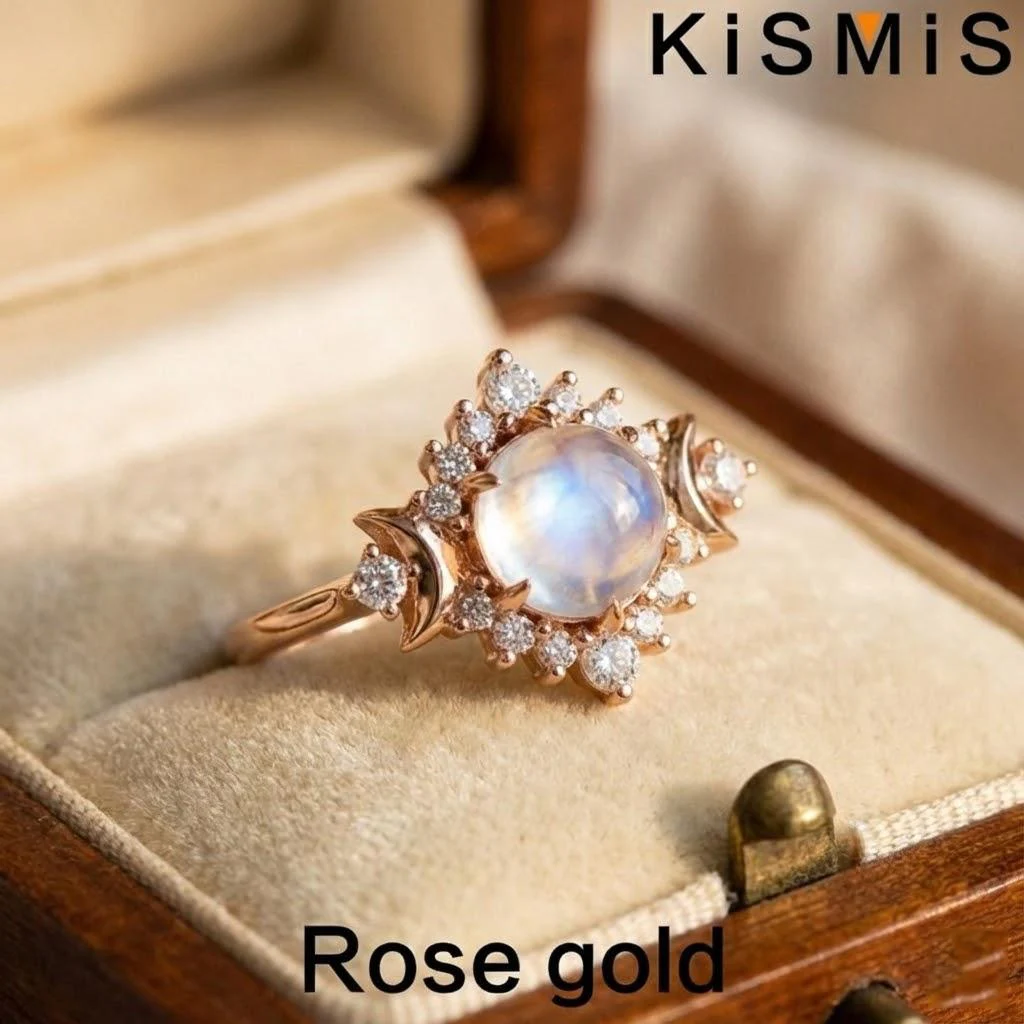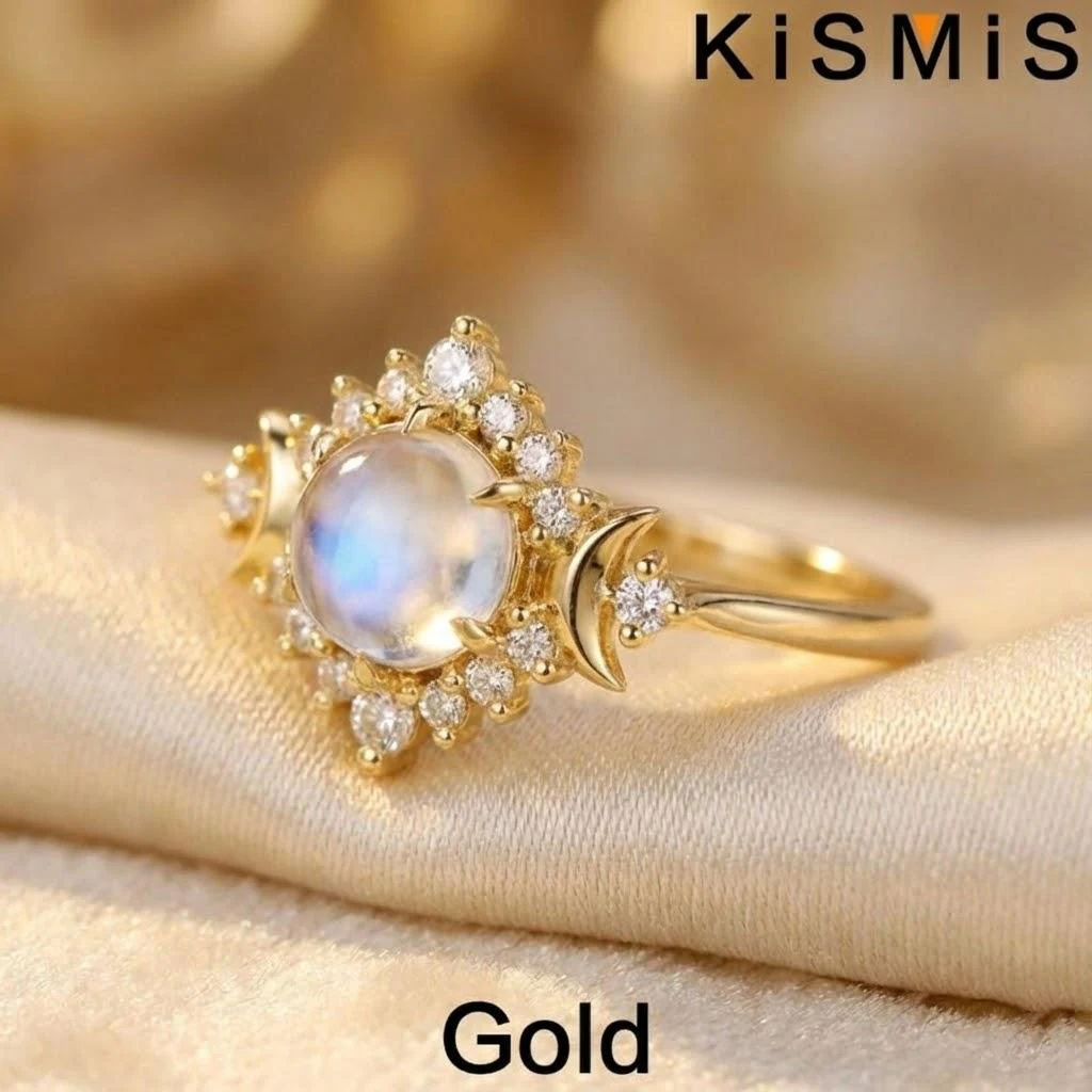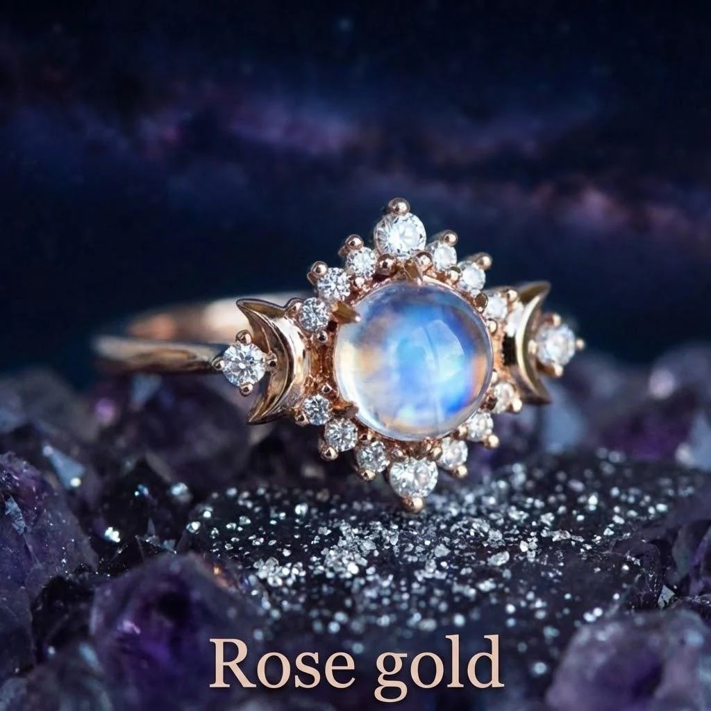 - Features charming crescent moon-shaped accents on either side of the main stone, adding a celestial and romantic theme to the design.