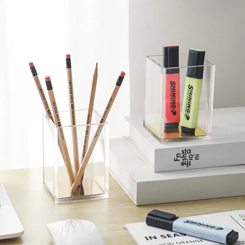Enhance your workspace with this elegant acrylic desk organizer pen container, measuring 7.8 x 7.8 x 11 cm with a 5 mm thickness and weighing 220 grams. Crafted from durable acrylic and iron, it features a sleek, transparent design with a stylish rose gold finish option, embodying European modern aesthetics. Perfect for storing pens, cosmetics, or small office supplies, its minimalist yet sophisticated style seamlessly complements any desktop or office setting. The upgraded construction ensures long-lasting performance, making it a reliable and attractive addition to your professional or personal workspace. Experience the blend of function and refined design today.