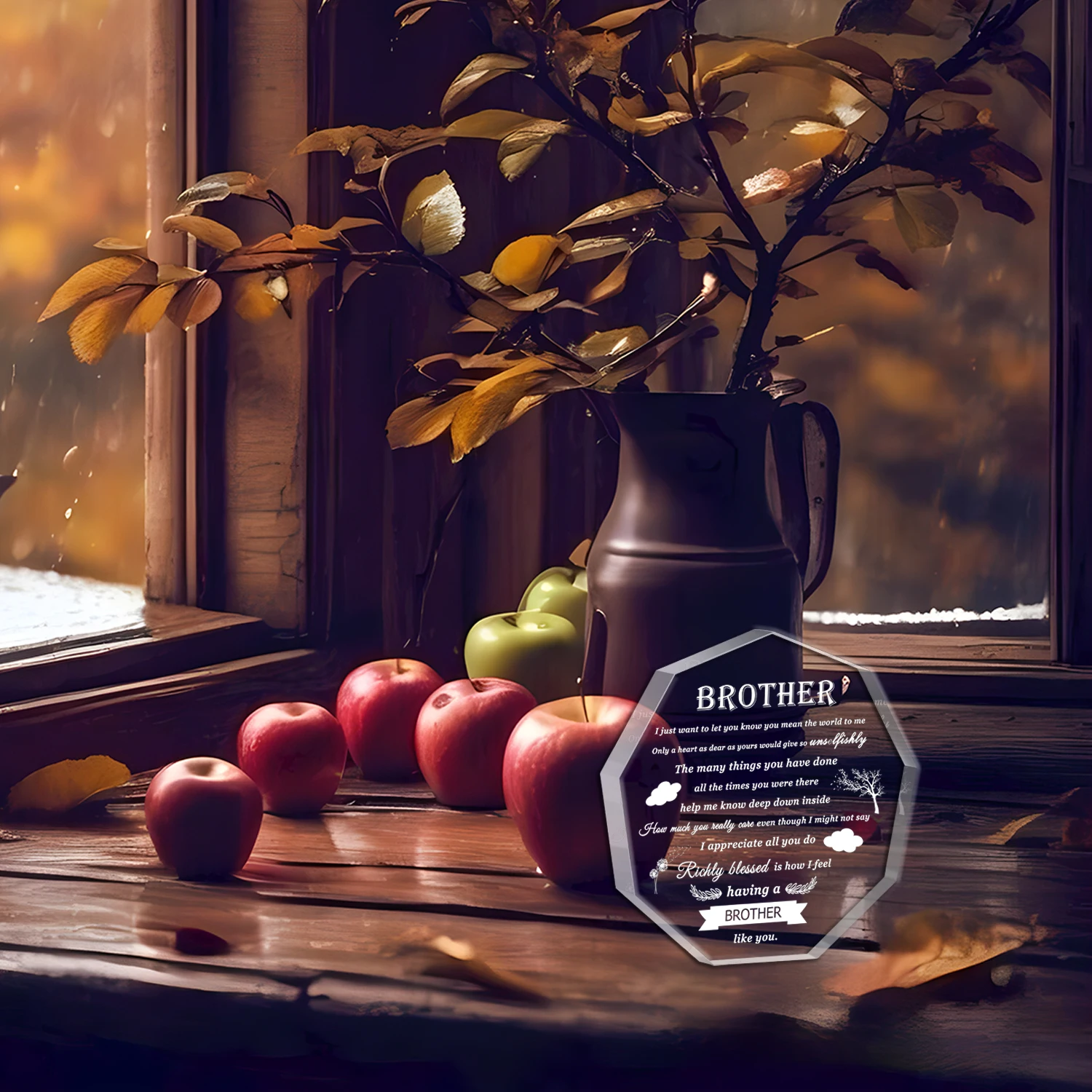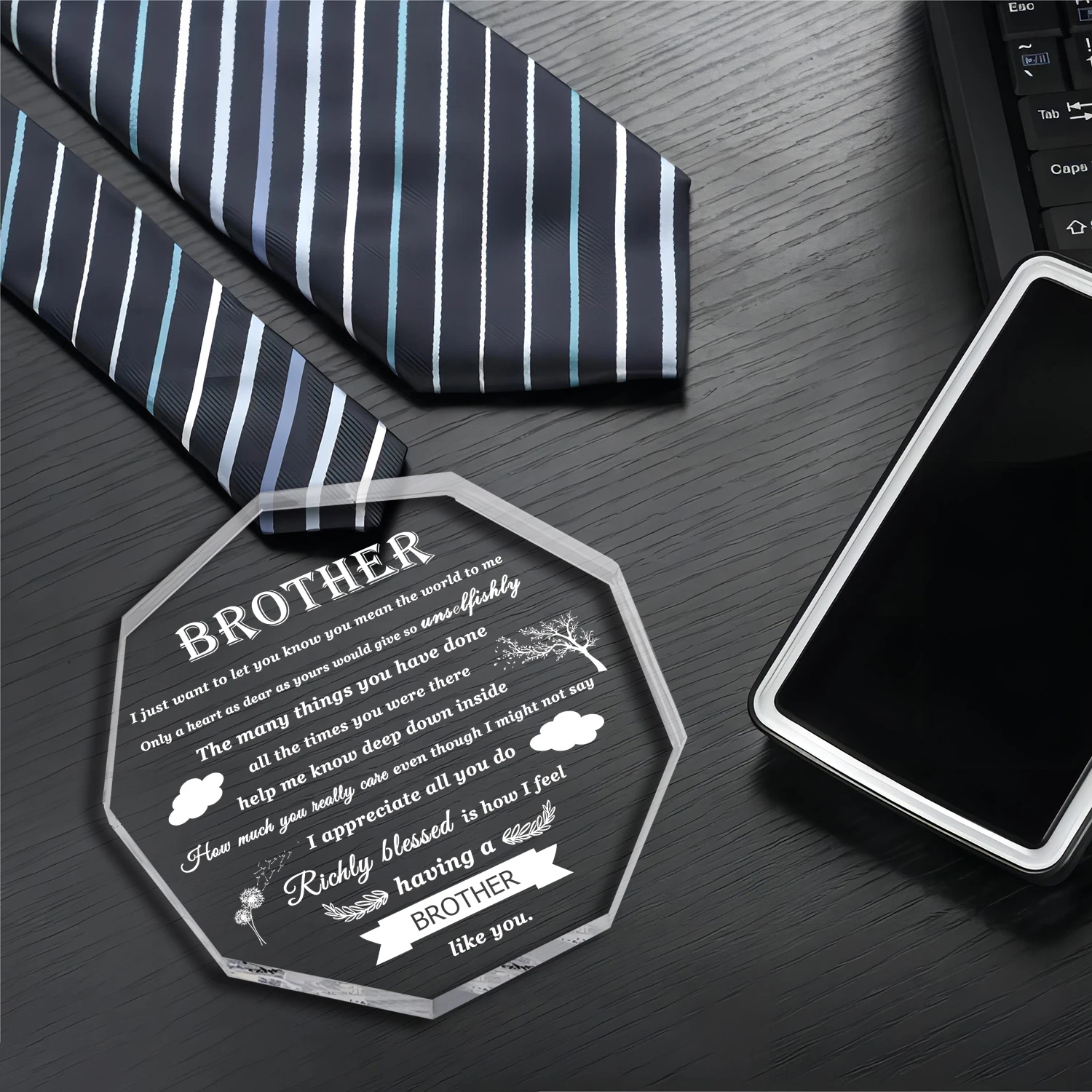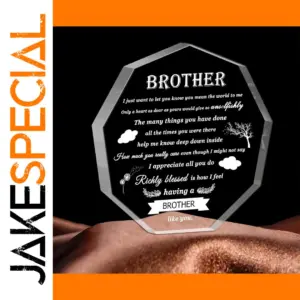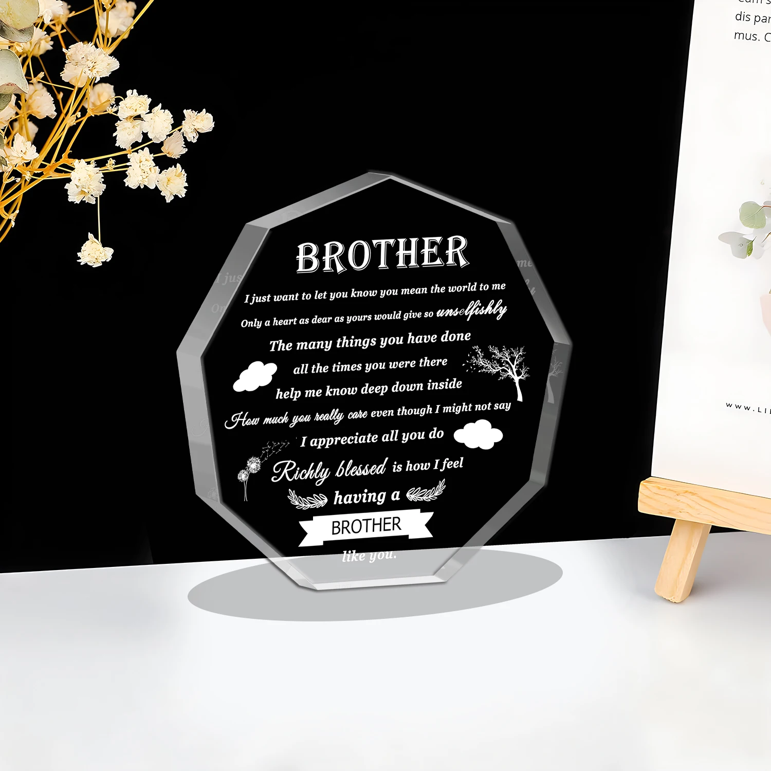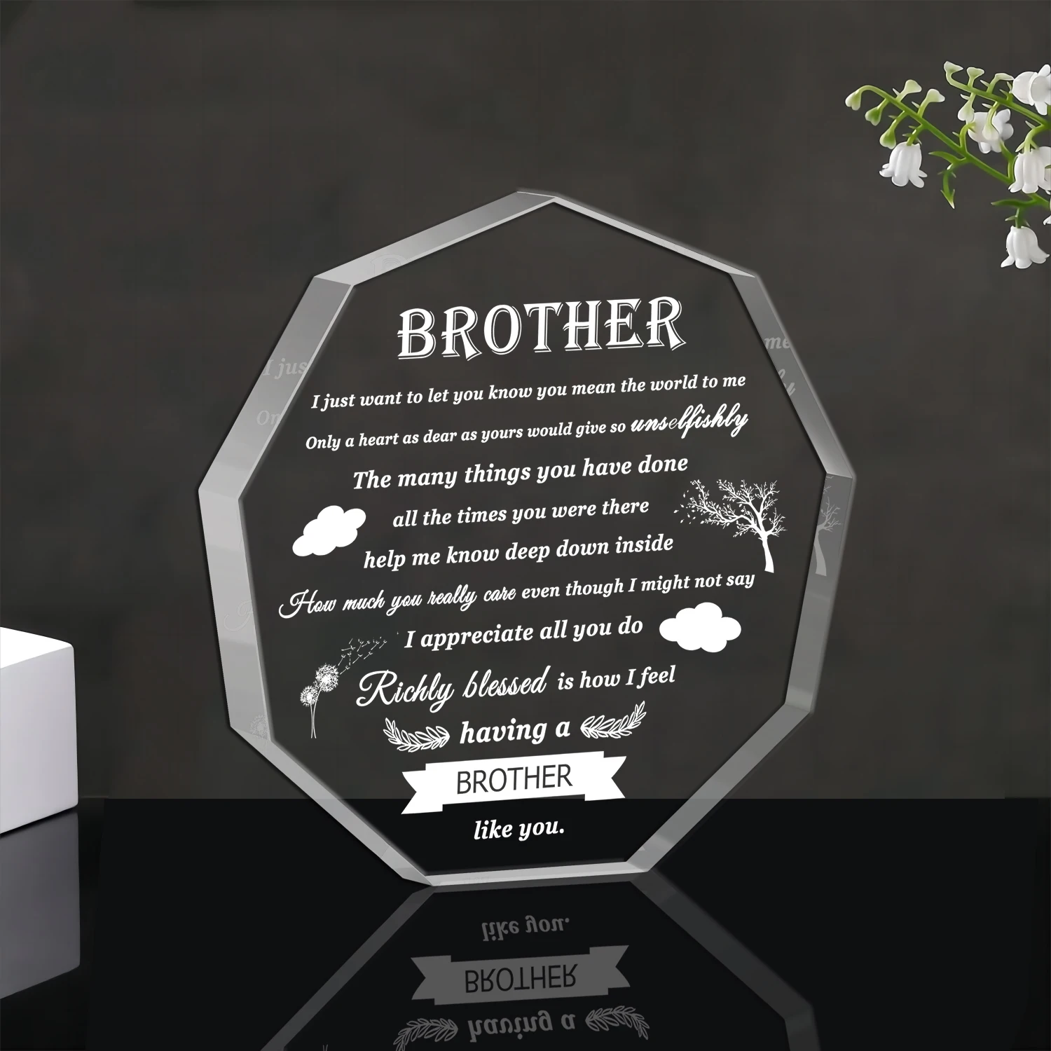 Celebrate your brother with this elegant acrylic gift featuring a sleek octagonal shape with beveled edges and a glossy, slightly frosted surface. The design showcases a heartfelt message engraved in white, accented by whimsical illustrations of clouds, a leaf sprig, and a dandelion seed head, all set against a dark background that enhances visual contrast. The bold “BROTHER” at the top in large serif font makes it a perfect sentiment for birthdays or Father’s Day. Made of plastic with no chemicals involved and finished in model color code DM-1539, this modern and personalized keepsake adds a touching touch of appreciation to any special occasion.