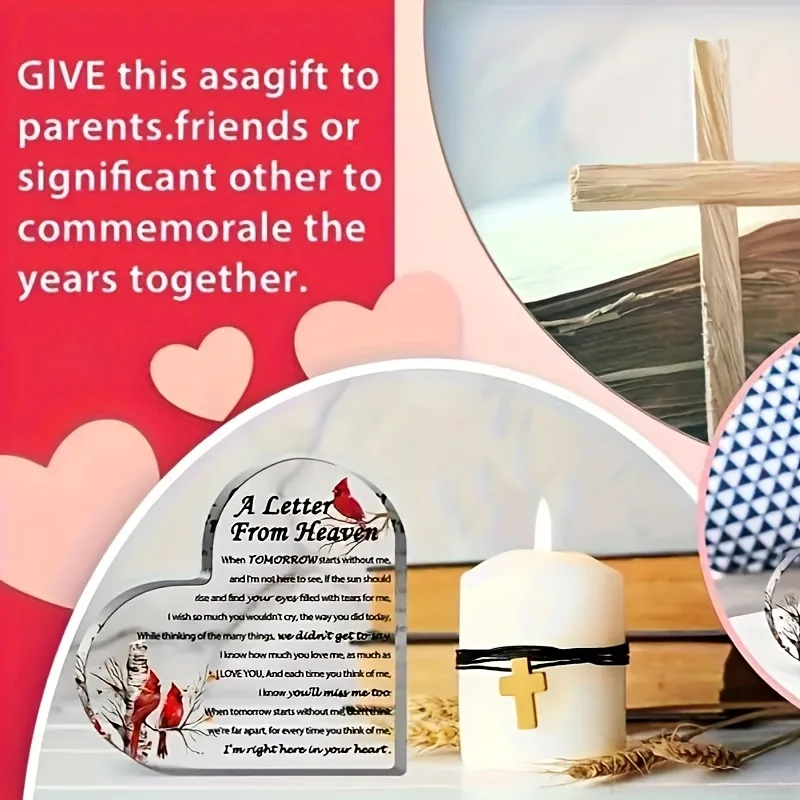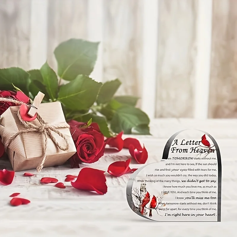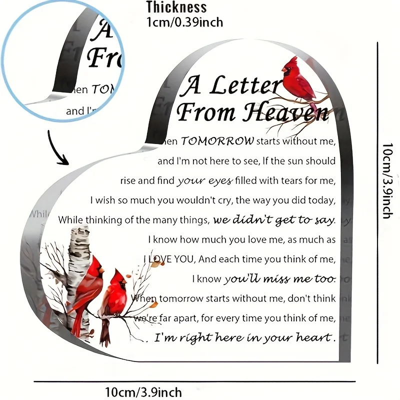 Imagine holding this beautiful acrylic heart that beautifully captures your memories and love for a deceased loved one. Crafted from glossy, transparent acrylic, it radiates elegance and serenity. The heart features a heartfelt poem titled “A Letter From Heaven,” written in various stylish fonts, including cursive and bold, that evoke comfort and remembrance. Delicately perched on leafless branches are vibrant red cardinals, symbolizing hope and eternal connection. Their detailed, bright red feathers and natural bark-patterned branches add a realistic touch to the piece. Perfect as a memorial gift, this keepsake serves as a lasting tribute, bringing solace and treasured remembrance into your space with its respectful and refined design.