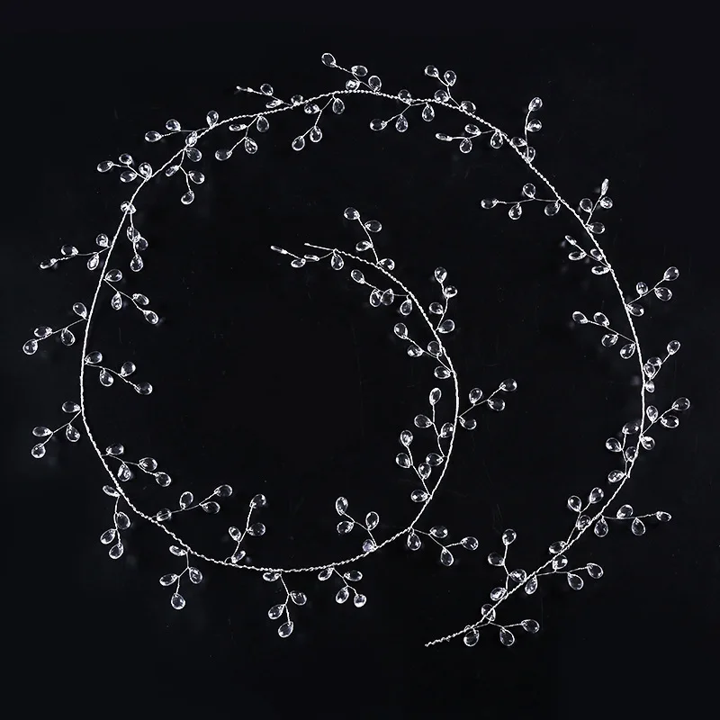 - Technical specifications include: Length options of 100cm, 120cm, 130cm, and 150cm; bead shape: water-drop diamond; material: acrylic and aluminum wire; color: white, transparent.