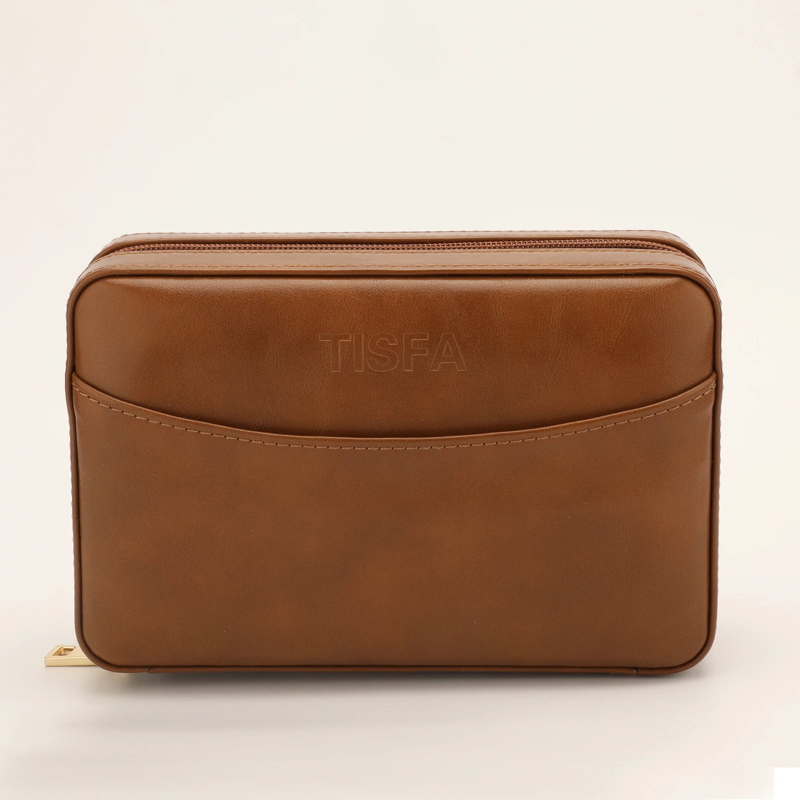 - Features two detachable cedar wood trays with 1-inch diameter slots, leather straps, and a card slot for humidity packs, making organization and transport effortless.