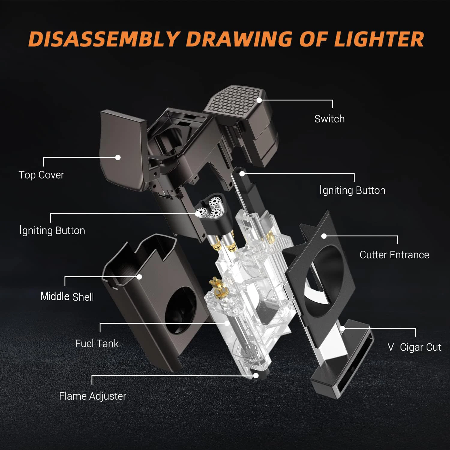 - Equipped with a multifunctional zinc alloy cigar lighter with three windproof blue jet flames, a stainless steel V cutter that cuts cigars up to 0.9″, and a leather accessory pocket.