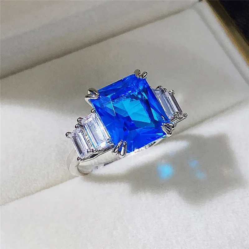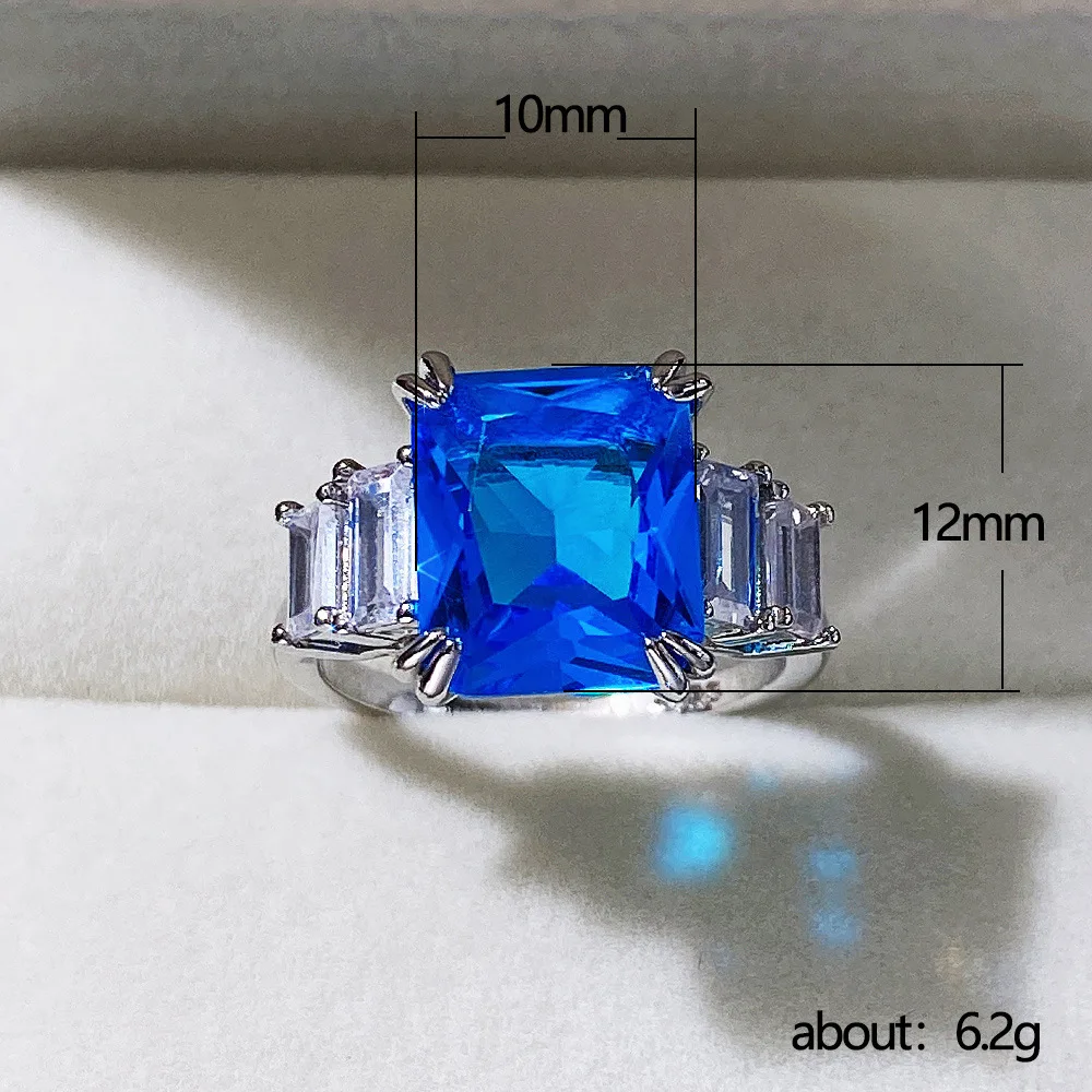 Enhance your special moments with this trendy women’s wedding ring, crafted in a sleek silver-colored metal with a polished finish. The rectangular centerpiece features a vibrant blue emerald-cut zircon, weighing approximately 0.98 grams, secured by four prongs. Flanking it are two clear, baguette-cut zircon stones in yellow and white hues, adding elegance and sophistication. Available in sizes 6, 7, 8, 9, and 10, this gold-filled piece offers exceptional durability and a luxurious appearance, perfect for weddings, engagements, or parties. Its modern design, combined with the vivid color palette, makes this statement ring a versatile and timeless addition to any jewelry collection.