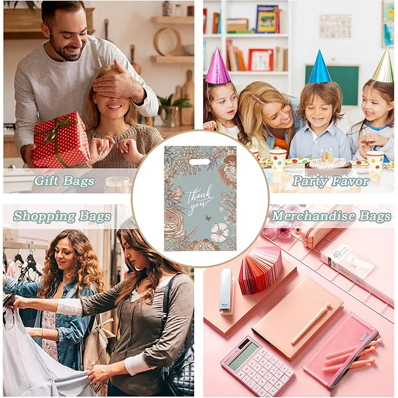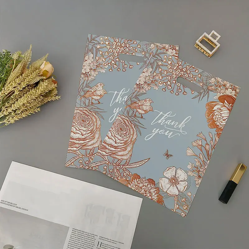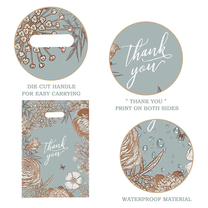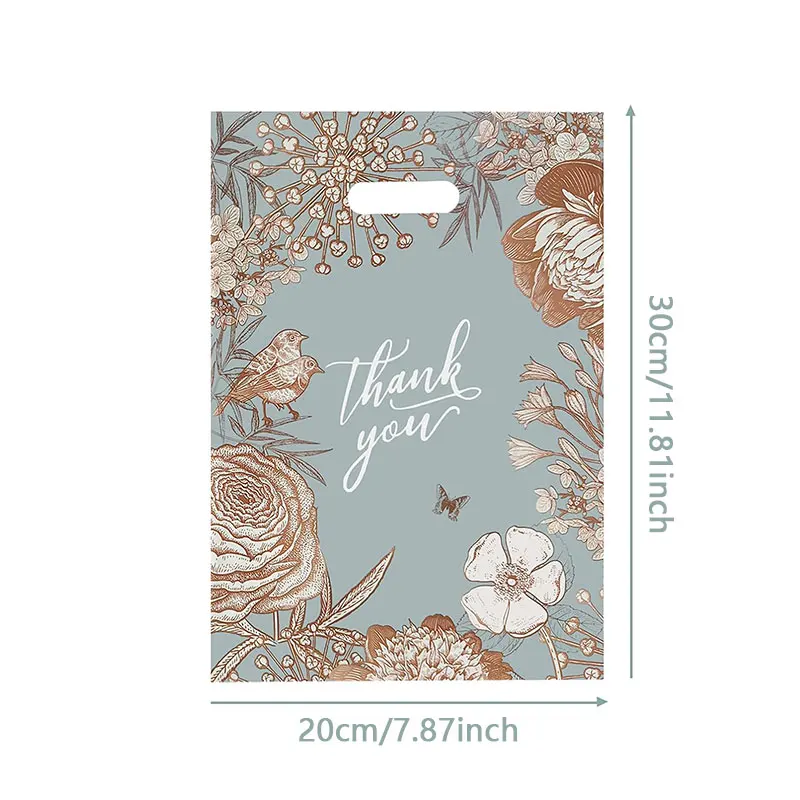 Imagine adding a touch of charm to your special occasion with these beautifully designed thank you plastic bags. Featuring a soft, muted blue background adorned with intricate floral and nature-inspired motifs, these bags showcase detailed illustrations of roses, peonies, delicate smaller blossoms, and lush foliage. Small birds perched on branches and a subtle butterfly bring a lively, nature-inspired vibe. The glossy finish highlights the artwork’s elegance, making each bag both charming and stylish. With integrated oval handles, these bags are practical and easy to carry, perfect for gifting or merchandise. Whether for weddings, birthdays, or holidays, they add a rustic yet refined aesthetic that impresses your guests and complements your event’s theme effortlessly.