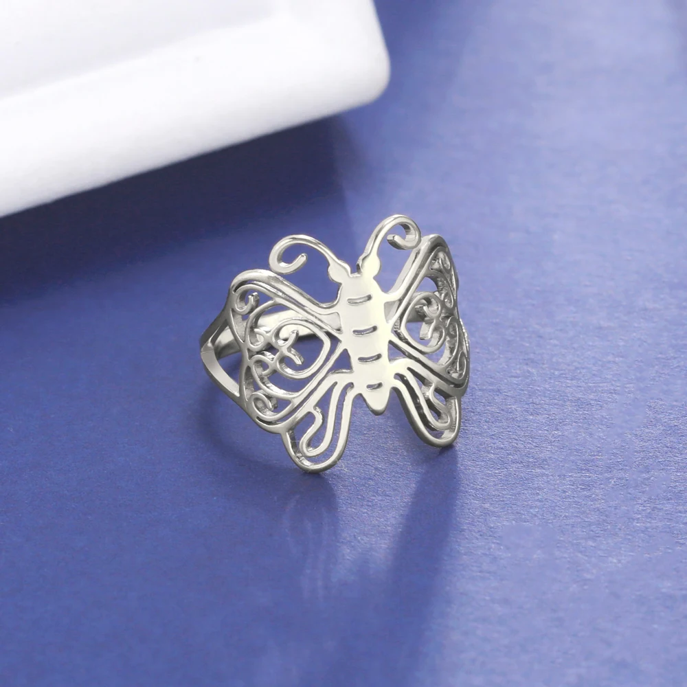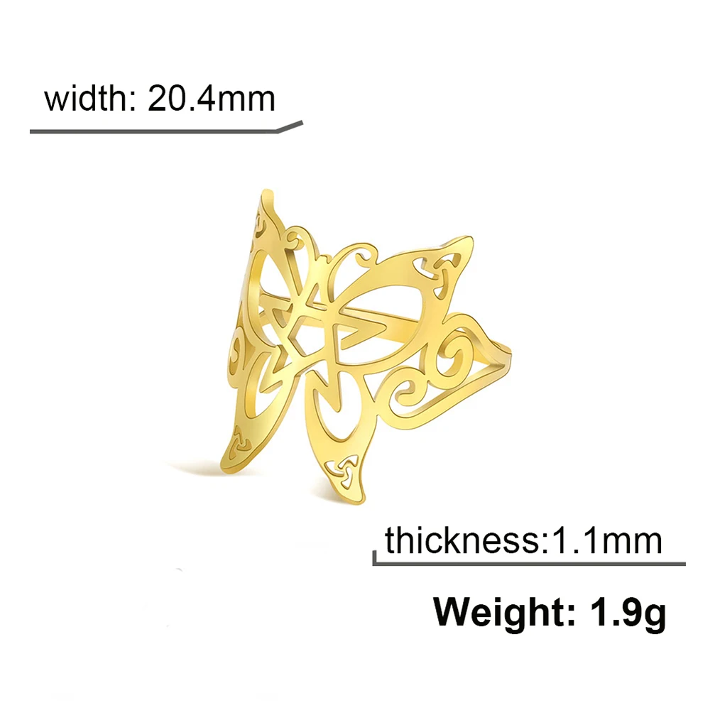 Imagine yourself wearing this stunning butterfly pentacle ring, crafted to elevate your personal style. The intricate openwork design combines mystical pentagram motifs with delicate butterfly shapes, creating a harmonious balance of whimsy and elegance. Made of durable stainless steel with a polished, shiny finish, this ring exudes sophistication and charm. Its smooth, rounded edges ensure comfort for daily wear, making it a perfect accessory for any occasion—whether a special party, casual outing, or meaningful celebration. Choose from gold or steel color options, all featuring 18k gold plating that resists fading and corrosion. This ring’s beautifully detailed craftsmanship means it catches the light beautifully, turning heads effortlessly.