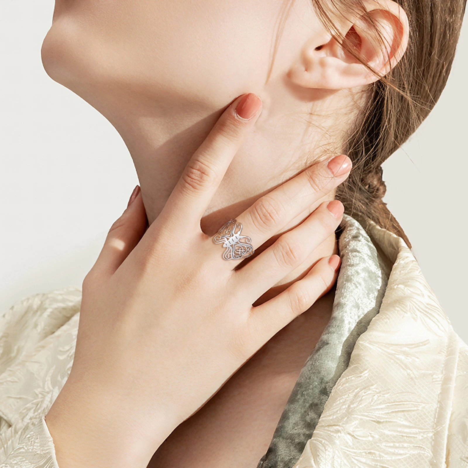 - Features an openwork design with detailed filigree patterns, blending animal and geometric elements to create a mystical and fashionable statement piece.