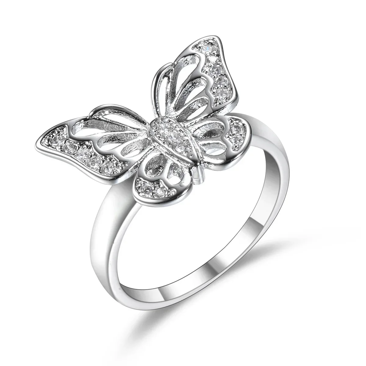 Imagine yourself wearing this exquisite butterfly-shaped silver ring, embodying elegance and whimsy. Crafted from durable platinum with a polished finish, this piece features a delicately open-winged butterfly motif, symbolizing freedom and beauty. The wings are adorned with tiny cubic zirconia stones along the edges and within openwork patterns, creating a dazzling sparkling effect that catches the light at every turn. The central body of the butterfly is encrusted with smaller zirconia stones, adding a shimmering focal point. Its smooth, slightly tapered band ensures a comfortable fit, making it perfect for both daily wear and special occasions. Whether for romantic anniversaries or stylish gift-giving, this ring offers a timeless feminine grace.