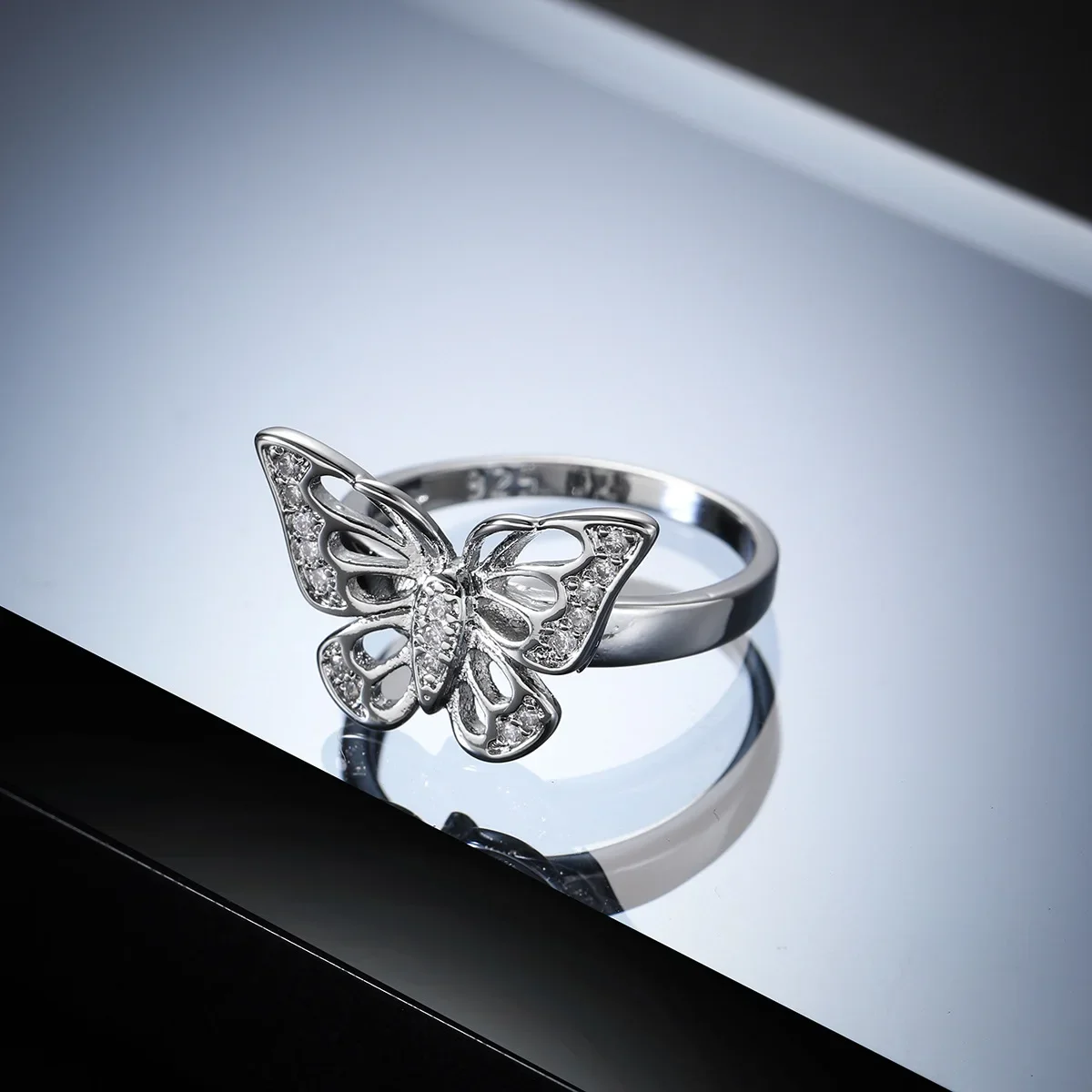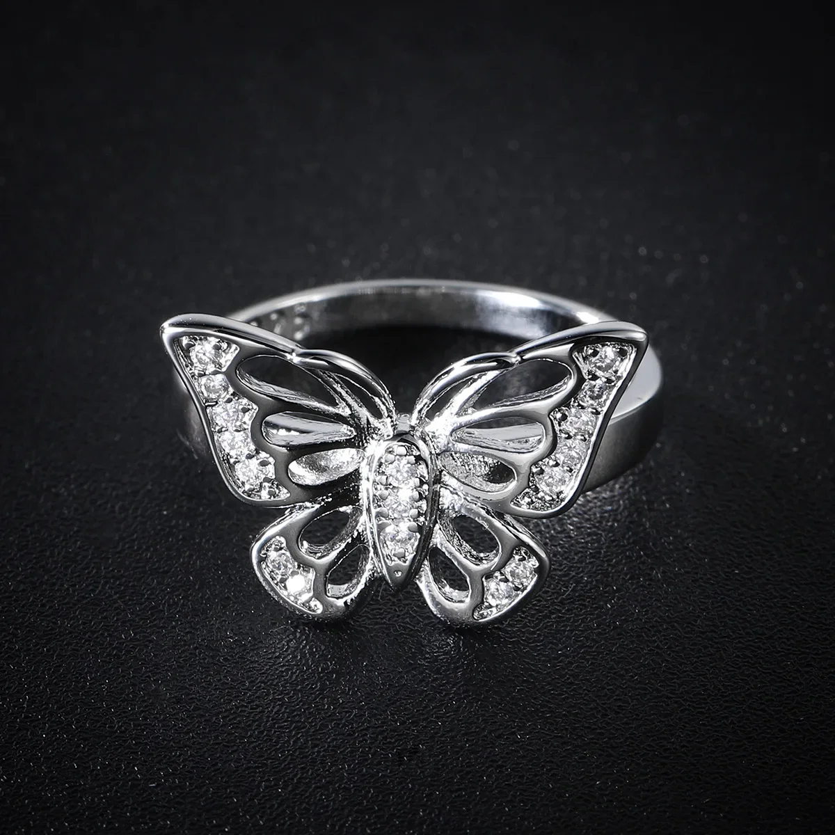 - Designed with a beautiful openwork butterfly motif, the wings are decorated with tiny cubic zirconia stones along the edges and within the pattern, enhancing its eye-catching sparkle.
