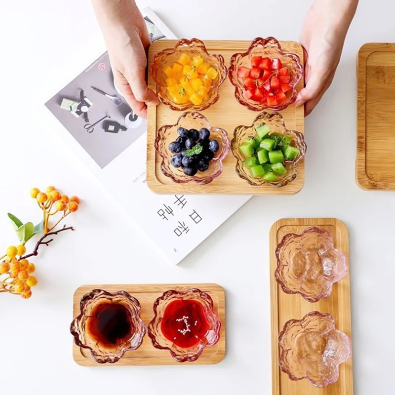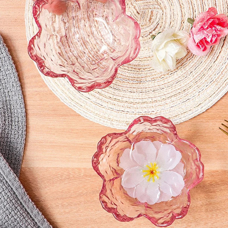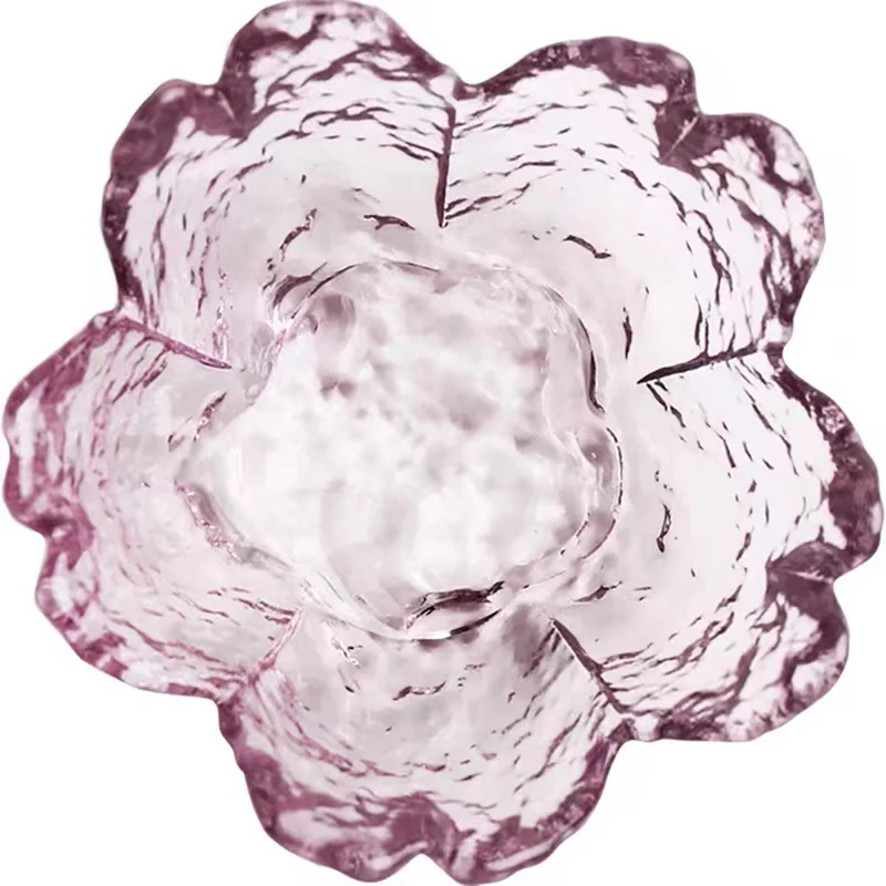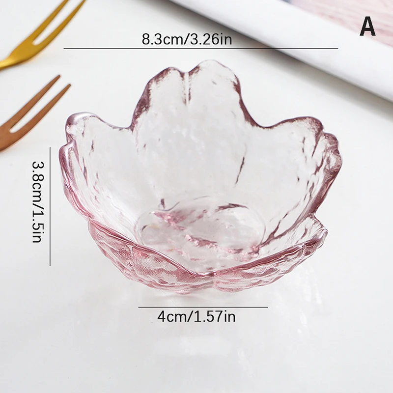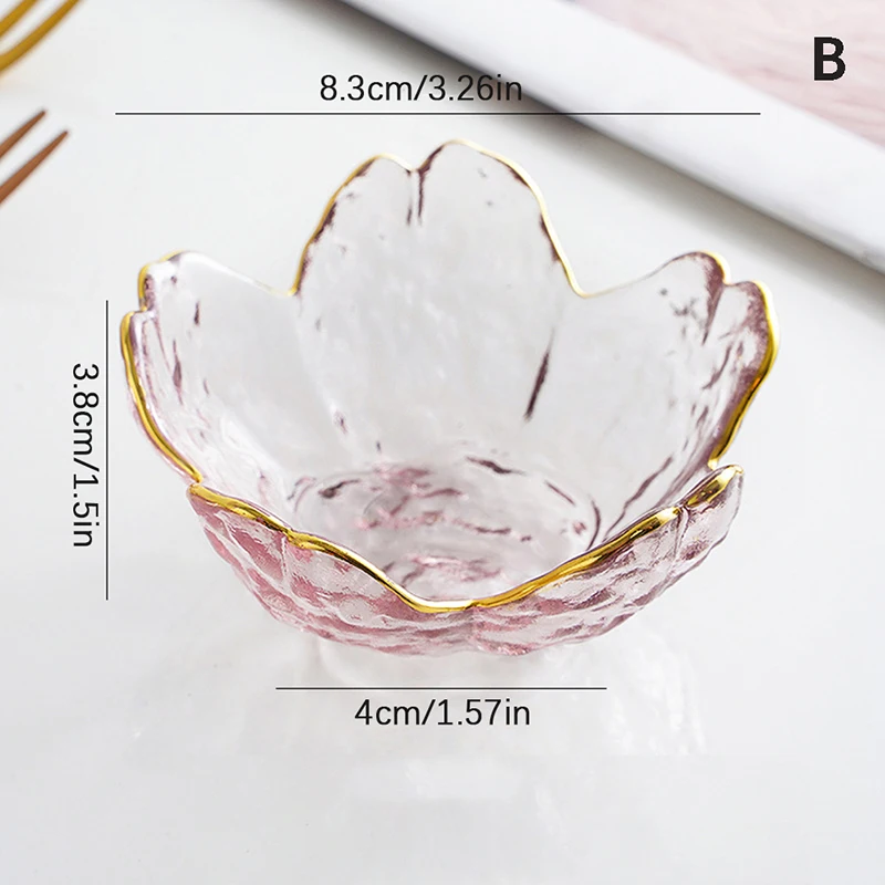 Transform your dining experience with this beautiful Japanese Cherry Blossom glass bowl. Designed to evoke the delicate beauty of sakura flowers, each bowl features uneven, ruffled petal edges crafted from high-quality, eco-friendly glass. Its transparent pink hue enhances the floral aesthetic, while the metallic gold trim adds a refined touch. With a smooth, polished interior and a textured, frosted exterior, this bowl offers durability, stability, and a soft matte finish. Its versatile size — 8.3 cm long, 3.8 cm wide, and 4 cm high — makes it perfect for serving an array of small snacks, sauces, desserts, and condiments. Add elegance and charm to your table setting, whether for everyday use or special occasions.