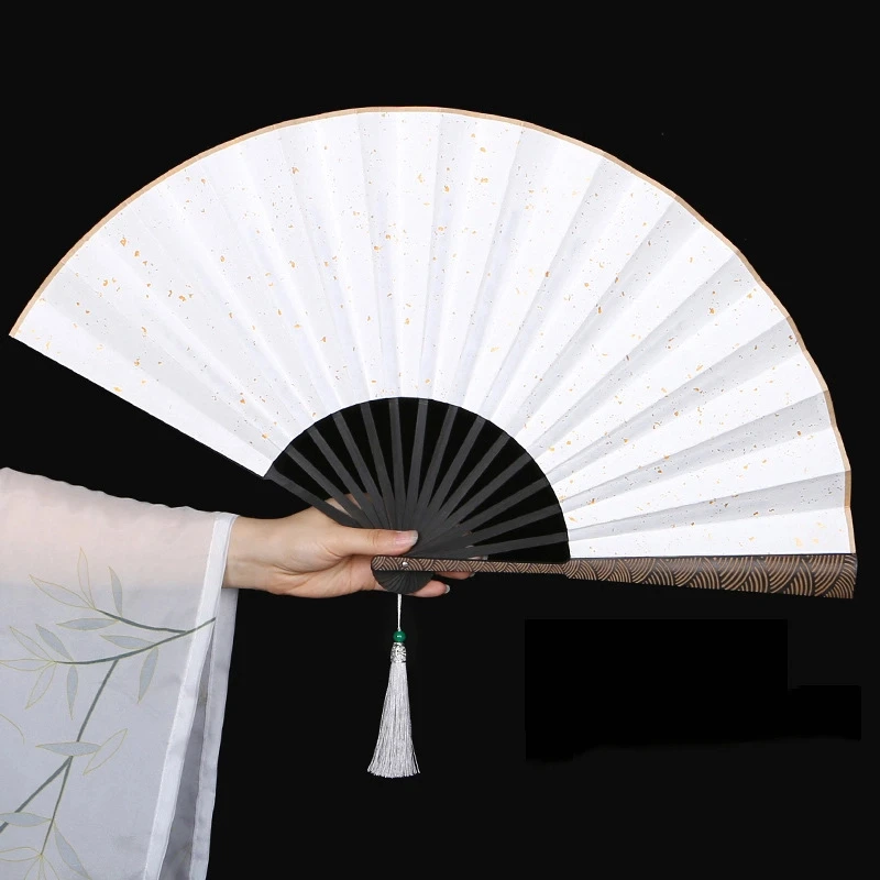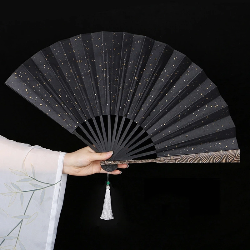 Experience the timeless beauty of this traditional Chinese hand fan, perfect for adding a touch of cultural elegance to your collection. Crafted from high-quality waterproof silk, it features an exquisite hand-drawn cloud design with subtle gold speckles that shimmer in the light. The fan's 62 cm length when fully open offers a graceful, sizeable surface for display or use. The black-painted wooden ribs provide a striking contrast, accentuating the scalloped, antique-inspired top edge that enhances its vintage charm. Decorated with a delicate silvery-gray tassel, this fan blends practical functionality with artistic craftsmanship. Whether for dance, fashion, or cultural display, this piece invites you to embrace elegance and tradition in every fold.