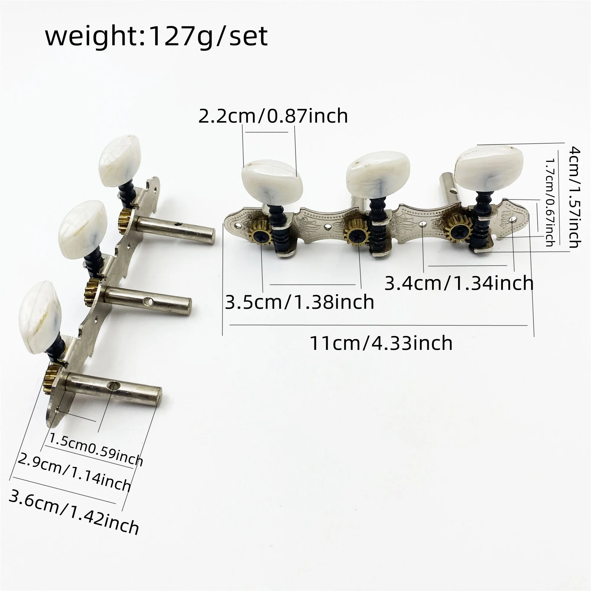 Discover the timeless beauty and reliability of this classical guitar tuning peg set, designed with vintage-inspired details and modern durability in mind. Featuring waist-shaped black rods with mica heads, these tuning pegs provide both style and functionality. Crafted from high-quality metal with a sleek silver finish, they incorporate ornate, scalloped-edged mounting plates and small, gold-colored gear wheels for smooth tuning adjustments. The set includes two three-string knobs, each with double-hole steel columns and ABS black heads, offering a perfect fit for classical guitars. With a weight of 126.4 grams, this set is lightweight yet sturdy, making tuning precise and effortless. Installing this set will enhance your guitar’s aesthetic while providing dependable performance for years to come. Envision your guitar with these elegant, vintage-style tuning pegs—an investment in craftsmanship and style.
