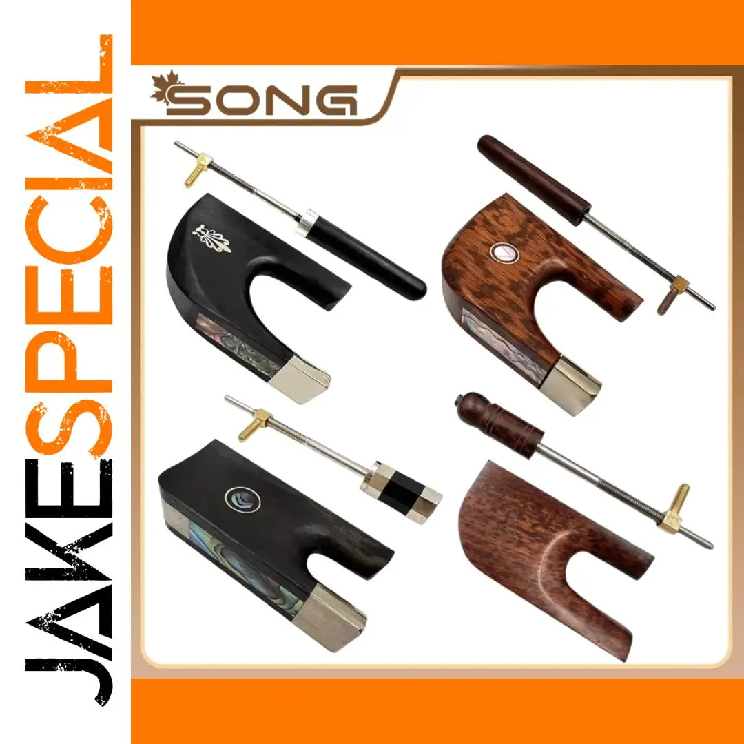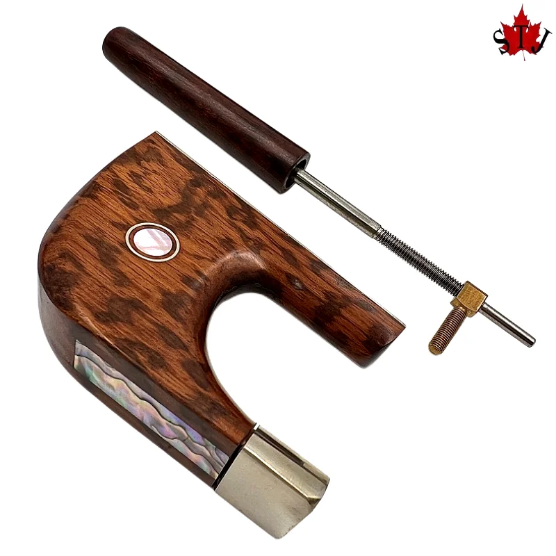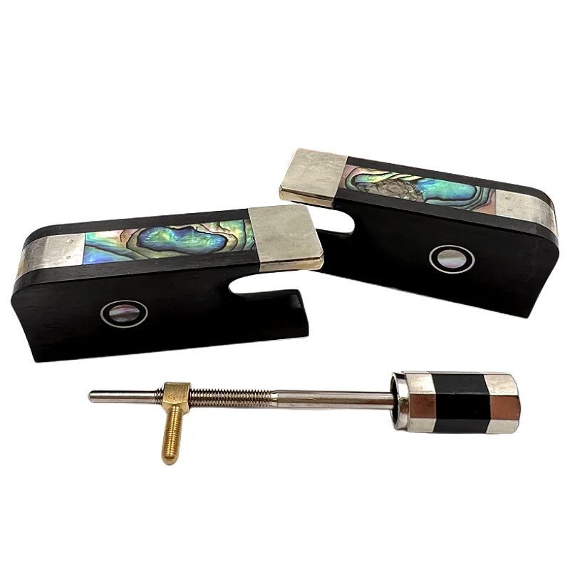 Transform your upright bass experience with this exquisite German-style double bass bow frog, crafted from premium snakewood and ebony. Its sophisticated design features intricate inlays, including a vibrant colored abalone shell and a double pearl eye, elevating both functionality and visual appeal. The frog offers a perfect balance of durability and elegance, providing a comfortable hand feel suitable for professional musicians or passionate enthusiasts. With a copper-mounted screw button, it ensures secure positioning while allowing smooth operation. Whether you're replacing an old frog or upgrading your bow, this high-quality component will seamlessly integrate into your instrument, bringing renewed vitality and refined aesthetics to your playing. Experience the craftsmanship that reflects your dedication to music.