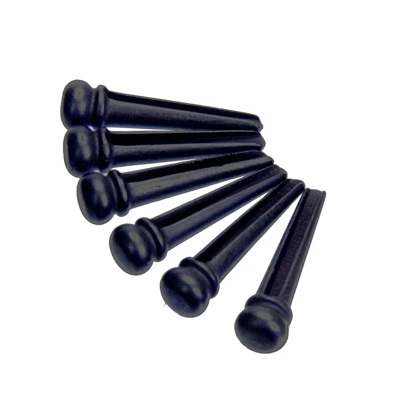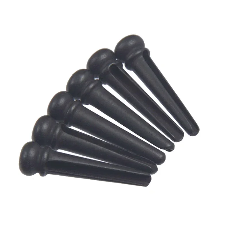 Enhance your acoustic guitar with this set of six ebony bridge pins, each approximately 30.35mm long, crafted from high-quality wood with a sleek black finish. Designed to fit most acoustic guitar bridges, these replacement pins are easy to install and will give your guitar a refined, polished look. Their smooth, glossy surface and minimalist design not only improve functionality but also elevate your instrument’s aesthetic appeal. Perfect for replacing lost or broken pins, this set combines durability and elegance, making it an excellent choice for guitar enthusiasts looking to maintain or upgrade the appearance of their instrument.