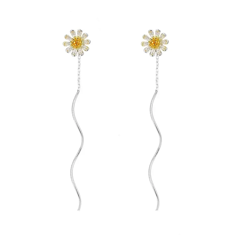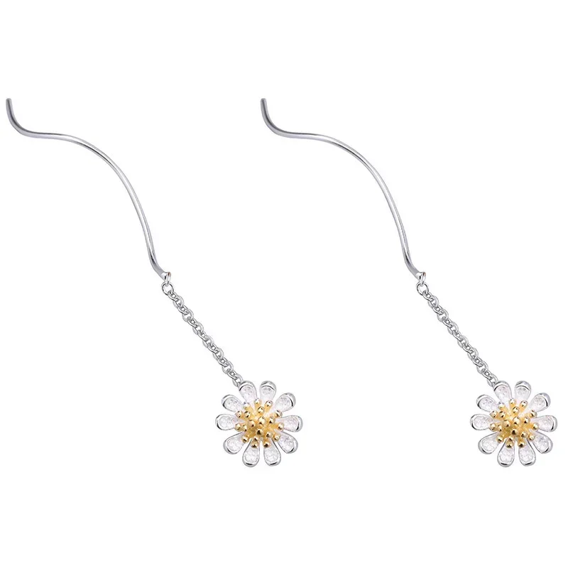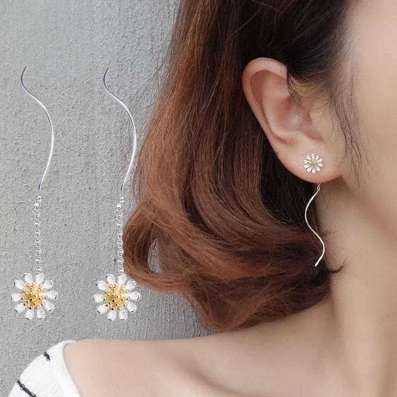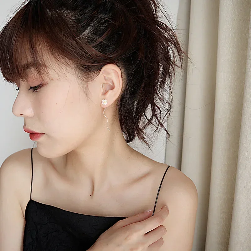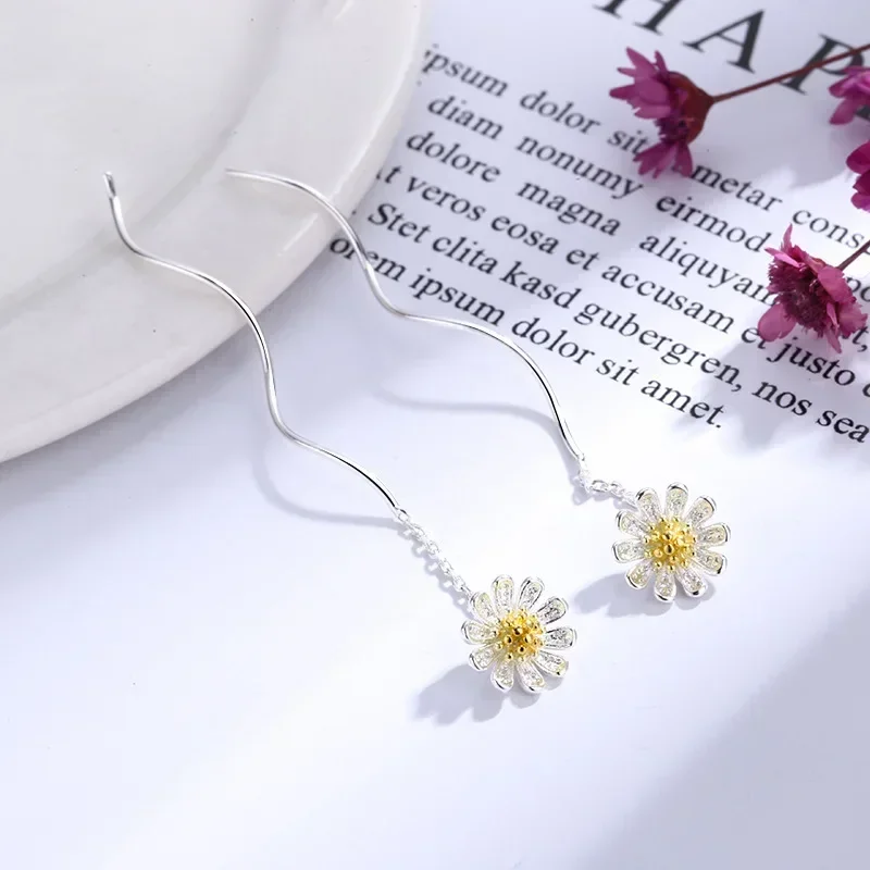 Enhance your elegant look with this delicate female ear chain crafted from 925 silver plating, featuring a charming daisy floral design with a white gem color and a graceful, long wavy tassel. Weighing only 0.8 grams, it offers a lightweight, comfortable fit perfect for special occasions such as weddings, anniversaries, or romantic gift-giving. The intricate floral pattern exudes a cute and romantic style, emphasizing feminine grace and youthful charm. Its versatile design makes it an ideal accessory for celebrations or as a thoughtful gift for loved ones, adding a soft luminous touch to any sophisticated ensemble.