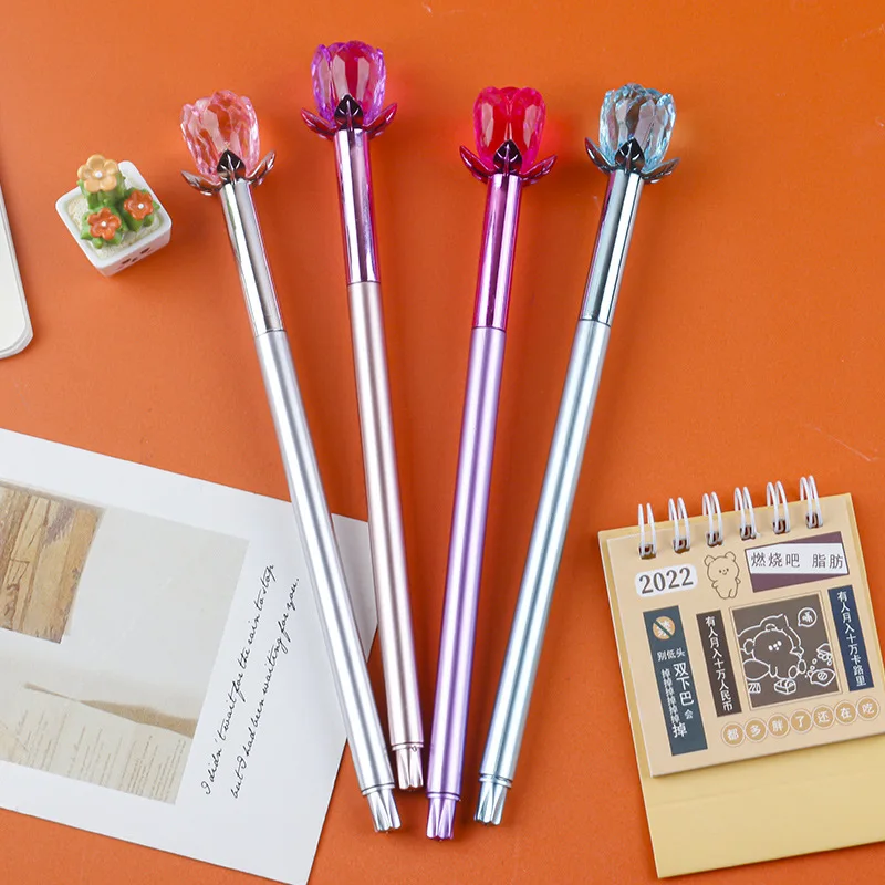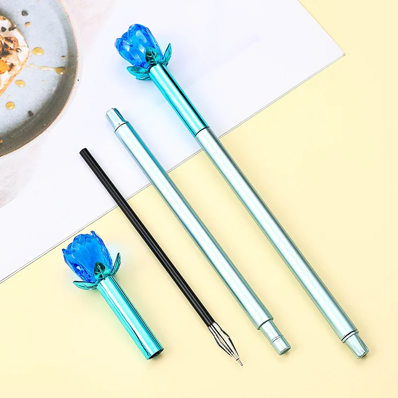 Experience the perfect blend of functionality and elegance with this set of four creative gel pens. Each pen features a transparent plastic body that highlights the black gel ink within, complemented by a dazzling crystal rose at the top in pastel blue, delicate pink, vibrant purple, and dark plum. The sleek silver metallic barrel and clip add a sophisticated touch, making these pens ideal for office, school, or gifting. With a 0.38mm black ink flow and 0.5mm writing tip, they provide smooth, precise lines suitable for detailed work or signature signing. Their floral, decorative design elevates everyday writing into a stylish experience, bringing joy and elegance to your desk or stationery collection.