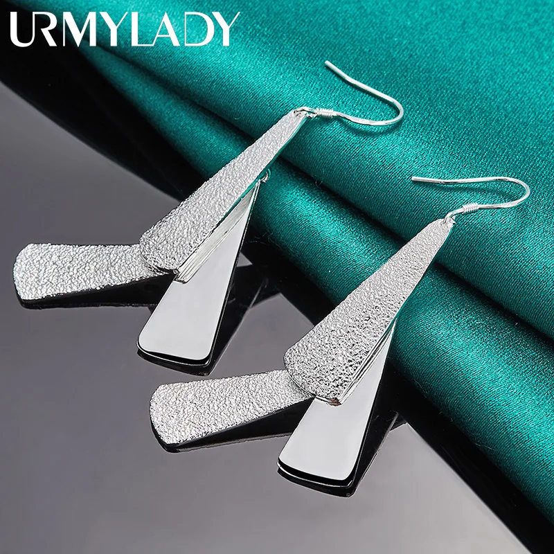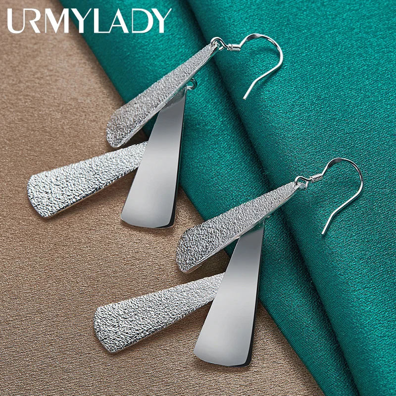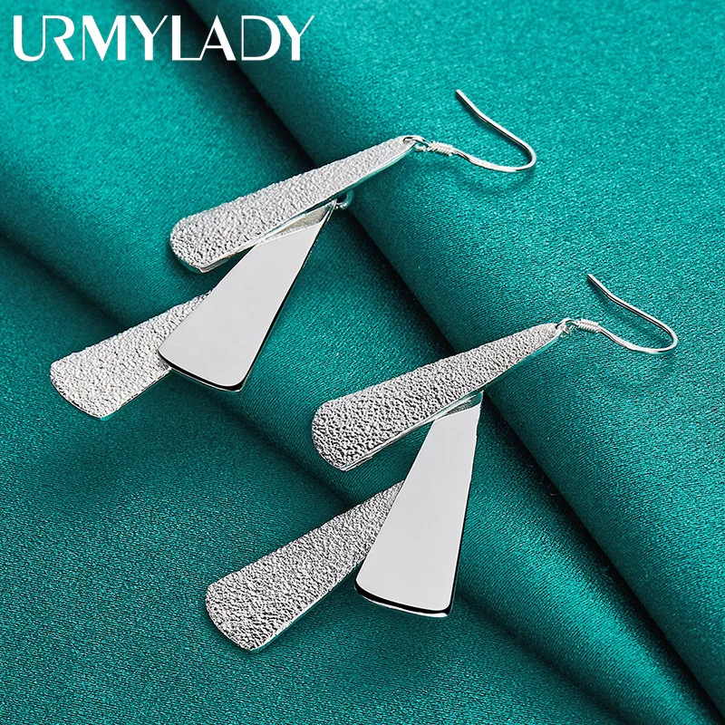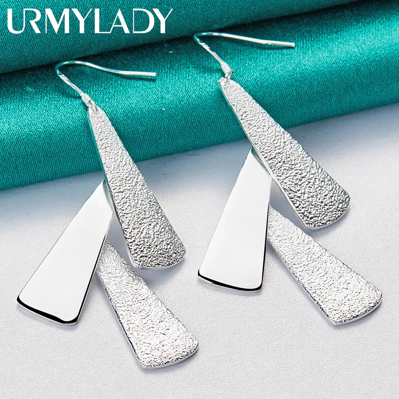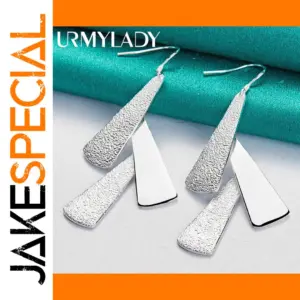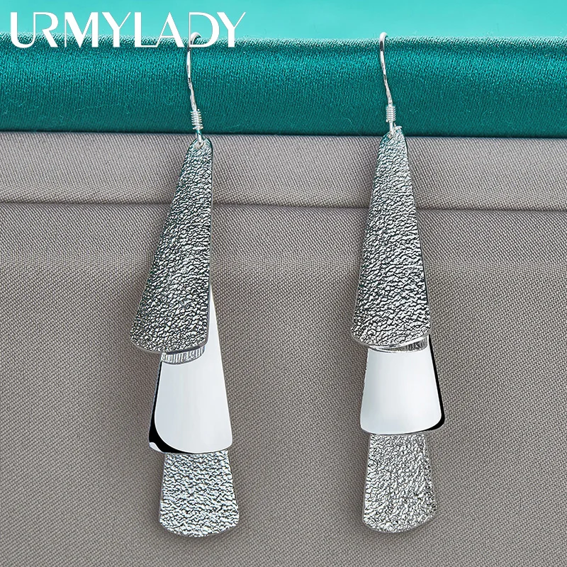 Envision yourself wearing these stunning earrings that perfectly blend modern design with sophisticated charm. Crafted from high-quality 925 sterling silver, they feature a three-sector geometric drop style that adds a trendy yet elegant vibe to any outfit. The notable contrast between the textured, matte finish on the top and middle segments and the smooth, polished bottom creates a striking visual effect. With an overall weight of approximately 11 grams, these earrings offer a substantial yet comfortable feeling, ideal for special occasions like parties and weddings. Their elongated, trapezoidal shape with gently rounded edges ensures they cascade beautifully, emphasizing your fashionable sense and making you stand out effortlessly.