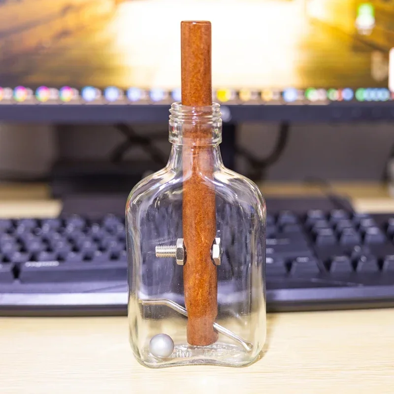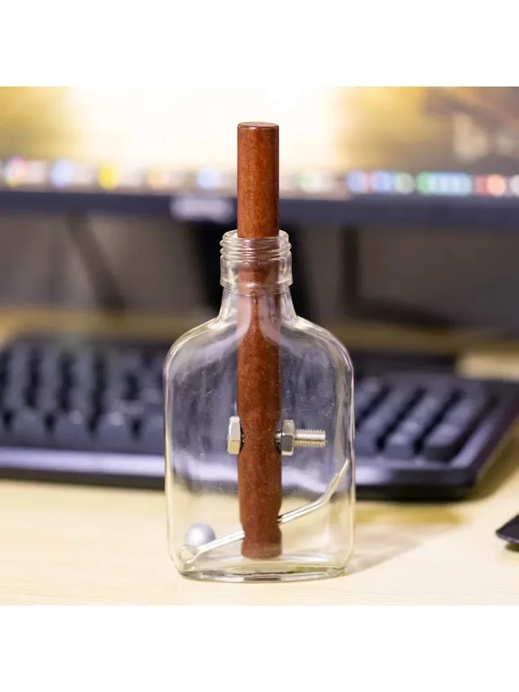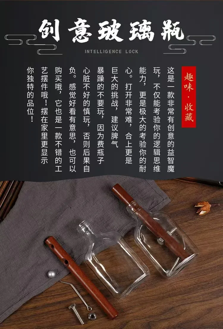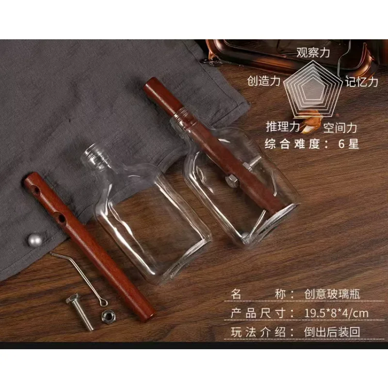 Imagine yourself unwinding with this beautifully crafted glass puzzle bottle that combines aesthetic finesse with mental challenge. Its clear, cylindrical form tapers gracefully at the neck, showcasing a sleek, modern silhouette. Inside, a polished, reddish-brown wooden rod stands upright, adding warmth and natural elegance, contrasted by metallic screws and wires that hint at industrial sophistication. This engaging decrypting activity features 10 difficulty levels, making it perfect for sparking curiosity or calming your mind. Its classical/post-modern style seamlessly blends timeless craftsmanship with contemporary design, ideal for home decor or thoughtful leisure. As you advance through each level, you'll appreciate the harmonious interaction of glass, wood, and metal, transforming puzzle-solving into an artful experience meant to inspire and relax. Discover the beauty of a challenge that’s both decorative and mentally stimulating.