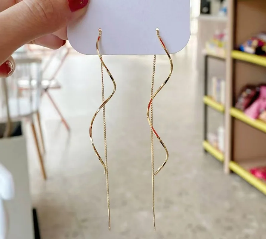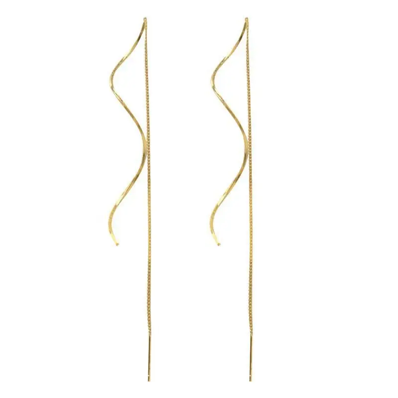 Imagine elevating your style with this stunning pair of long tassel threader earrings. Designed to make a sophisticated yet modern statement, these earrings feature a sleek, elongated metal component with a subtle wavy curve that catches the light beautifully in a gold-tone finish. The delicate, thin chain threads effortlessly through your earlobe, ending with a small cylindrical tip for secure wear. Their minimalist yet bold design complements any outfit, whether casual or formal. Lightweight and comfortable, they enhance your femininity with a touch of elegance and simplicity. Perfect for adding flair to your everyday look or special occasions, these earrings exude confidence and chic style in every detail.