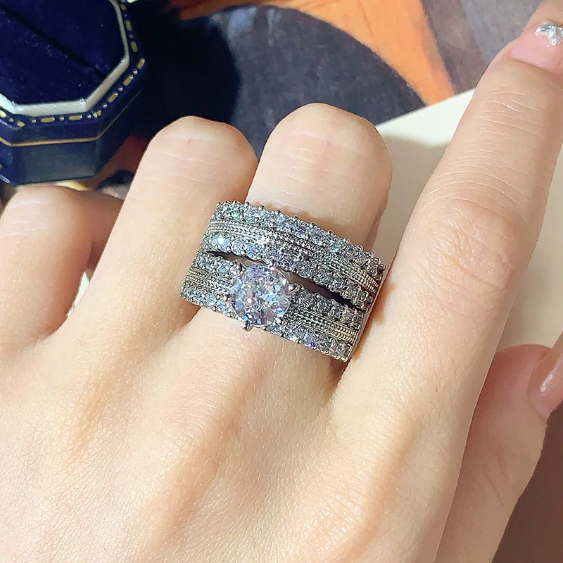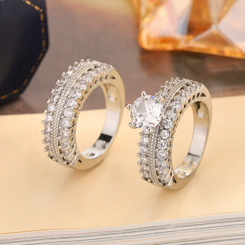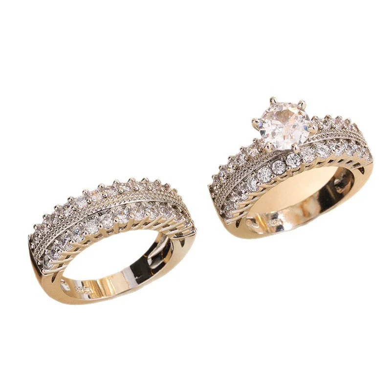 Immerse yourself in the luxurious beauty of this this bridal set, crafted for women who appreciate timeless elegance. Made with high-quality gold-filled material, the rings boast a stunning, polished finish that reflects light beautifully. Each ring features a substantial, smoothly rounded band adorned with symmetrical rows of dazzling white zircon stones. The centerpiece is a large, round-cut zircon held securely by four prongs, surrounded by smaller stones that create a brilliant continuous line of sparkle. Designed for weddings, engagements, or special parties, this set combines durability, elegance, and glamour, making it the perfect choice for meaningful celebrations or as a thoughtful gift for loved ones. Experience the perfect blend of craftsmanship and luxury with these sophisticated rings.