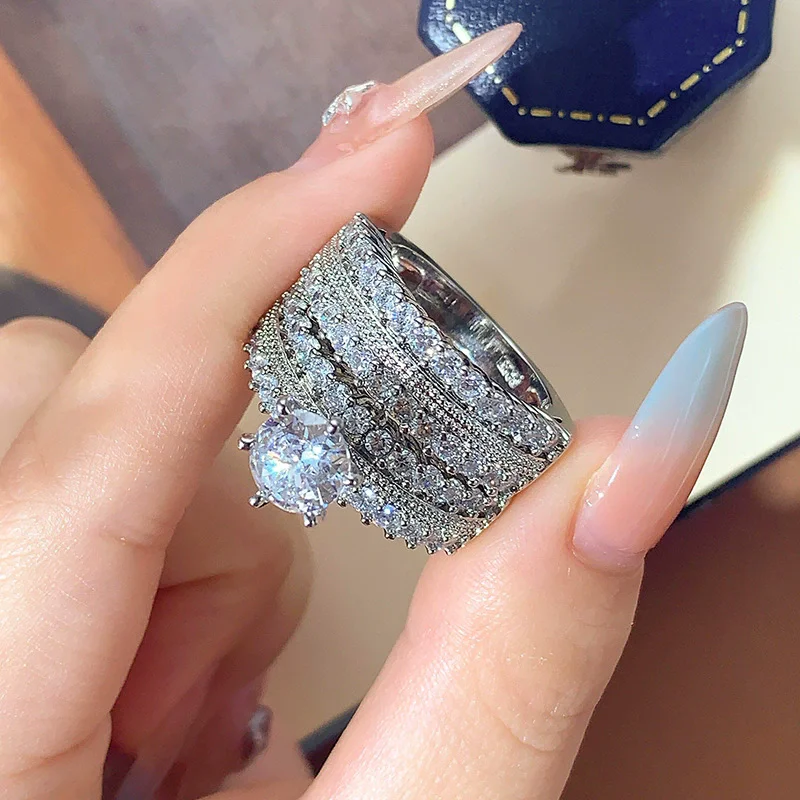 - Features a polished silver-tone finish with a smooth, comfortable rounded band decorated with symmetrical rows of shimmering white zircon stones for a dazzling effect.