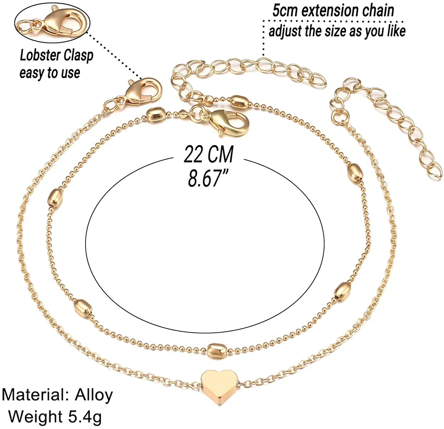Imagine adding a touch of refined femininity to your summer outfit with this beautifully crafted layered anklet. Made from environmentally friendly alloy, it shines with a polished, gold-tone finish that exudes elegance and grace. The delicately layered thin chains feature subtle beaded accents and a minimalistic heart charm, making it perfect for both casual and special occasions. Its adjustable length of 8.66″ with a 1.97-inch extension guarantees a comfortable fit. Wear it to beach outings, Weddings, or simply elevate your everyday look. Durable, hypoallergenic, and nickel-free, this anklet blends beauty with comfort, allowing you to feel confident and beautiful all day long, creating unforgettable style moments effortlessly.