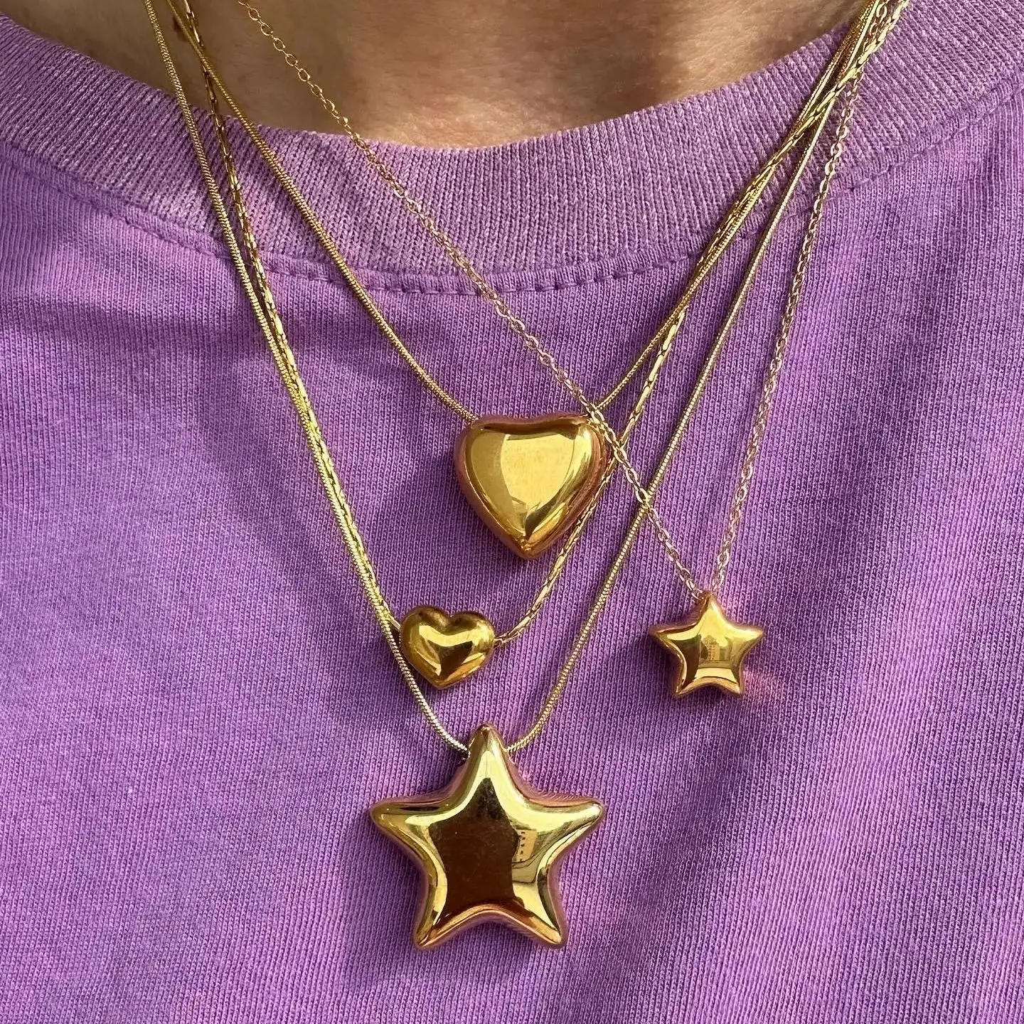 Enhance your style with this elegant women’s layered pendant necklace, crafted from durable 316L stainless steel with a long-lasting PVD gold finish. Weighing approximately 15 grams, it features four stunning pendants: a large, reflective five-pointed star, a smaller shiny star, and two rounded heart-shaped pendants—one larger with a convex surface and one smaller for a delicate touch. The fine, dainty chains create a fashionable layered look perfect for parties and stylish occasions. Waterproof, anti-scratch, and free of nickel, lead, and cadmium, this necklace offers both beauty and safety, making it a versatile addition to your jewelry collection.