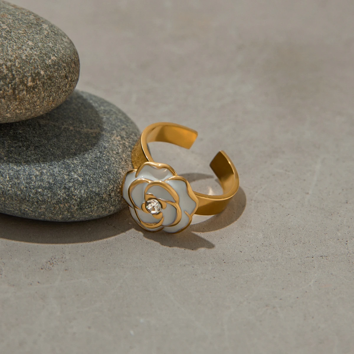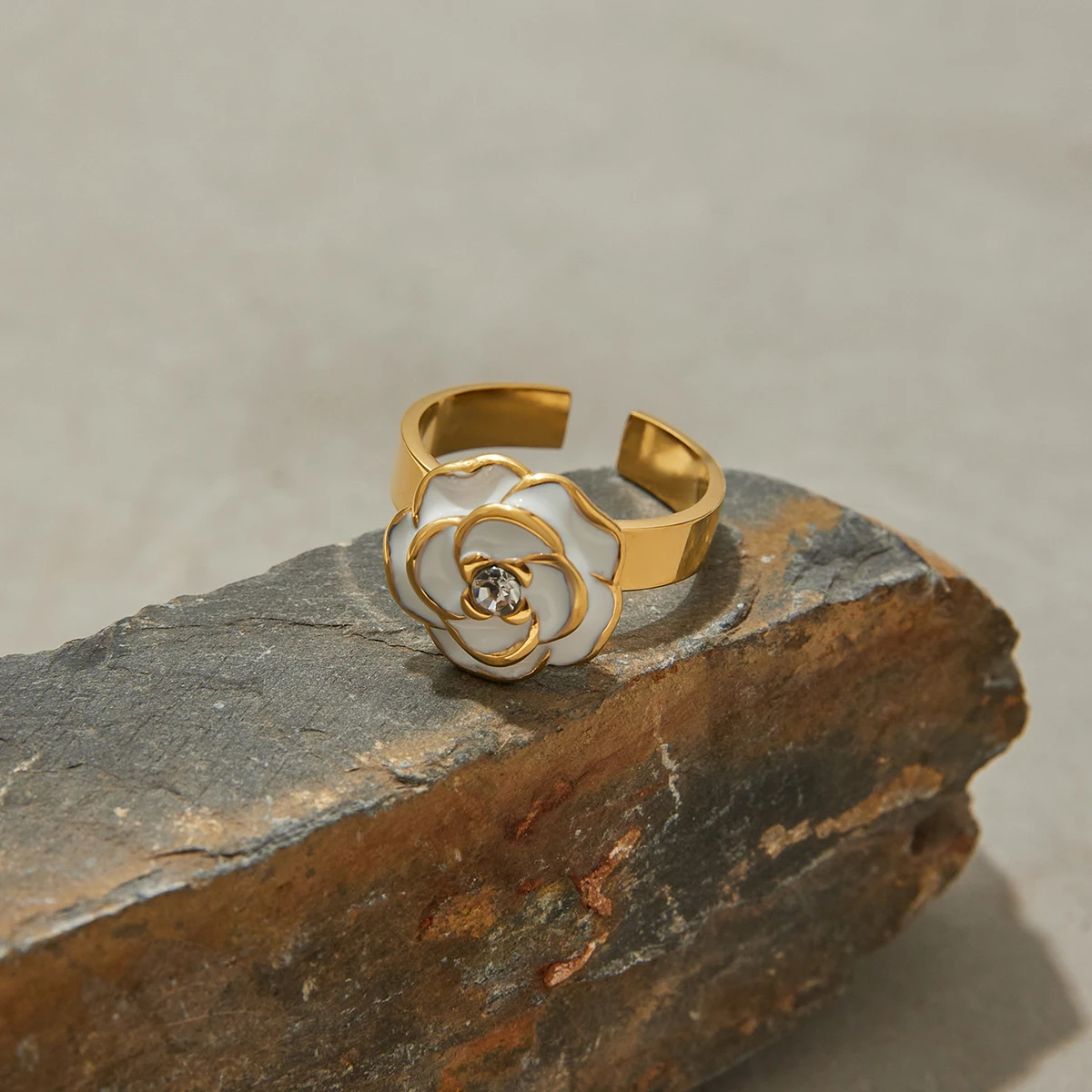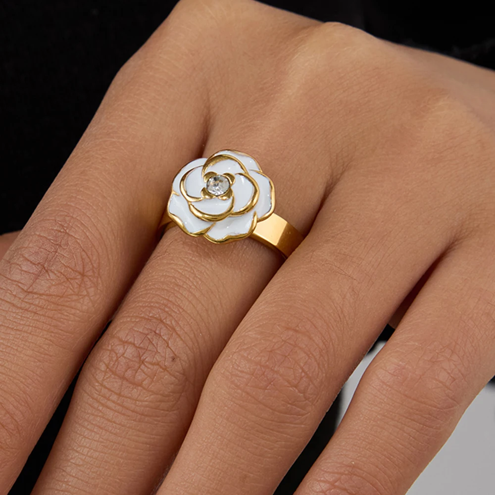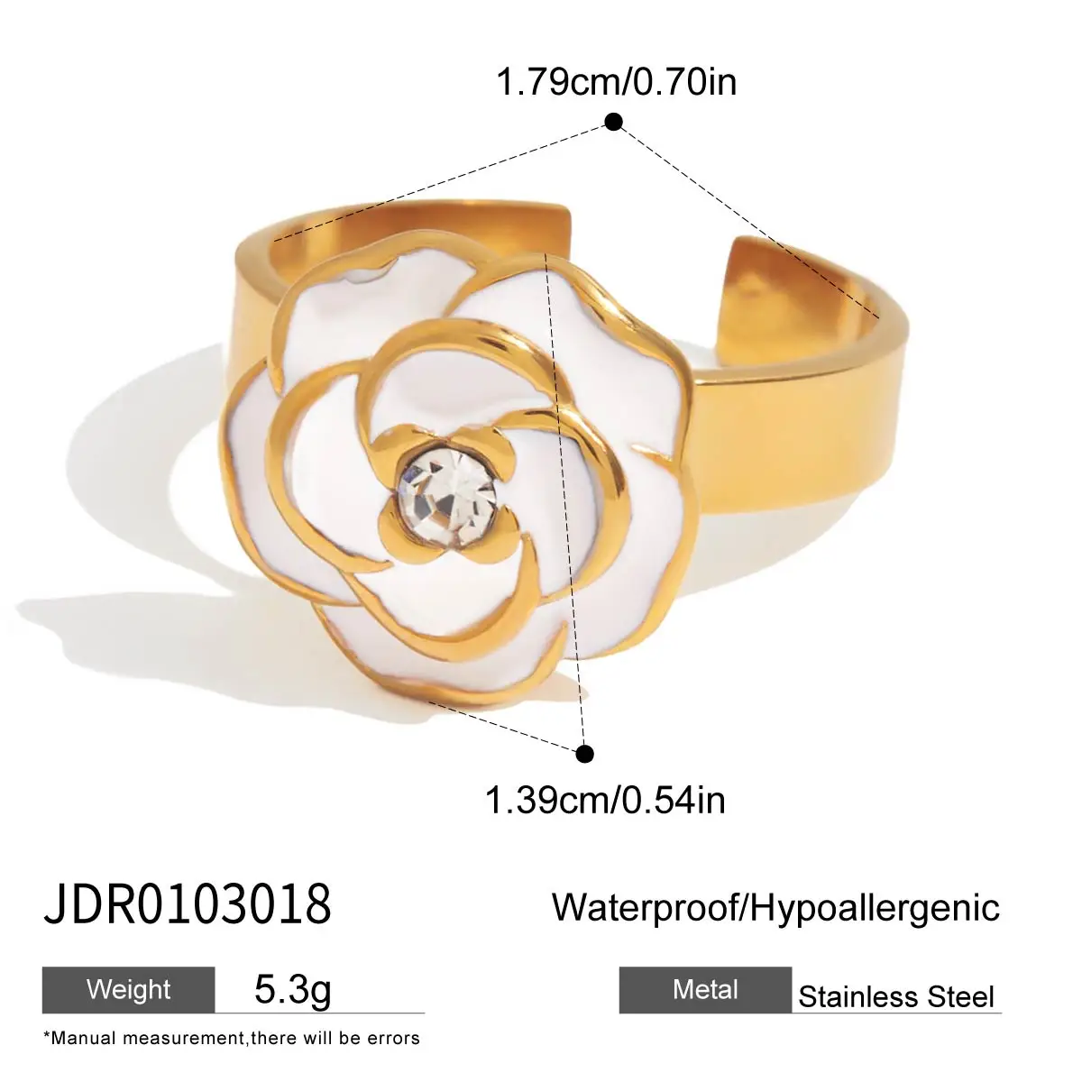This trendy stainless steel open ring features a 2mm wide gold PVD finish, offering long-lasting color, anti-scratch, and waterproof durability. Weighing approximately 15 grams, it showcases a delicate drip oil flower motif with a pave setting of sparkling crystal stones in a round shape. Designed to be adjustable, it comfortably fits all finger sizes and is perfect for fashionable occasions or parties. Crafted with a modern, eye-catching aesthetic, this jewelry piece combines elegance and trendiness, making it a versatile accessory for women seeking chic, durable jewelry for special moments.