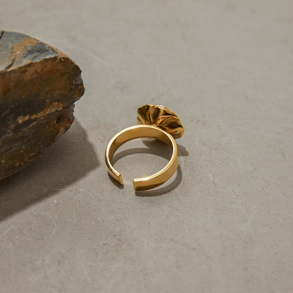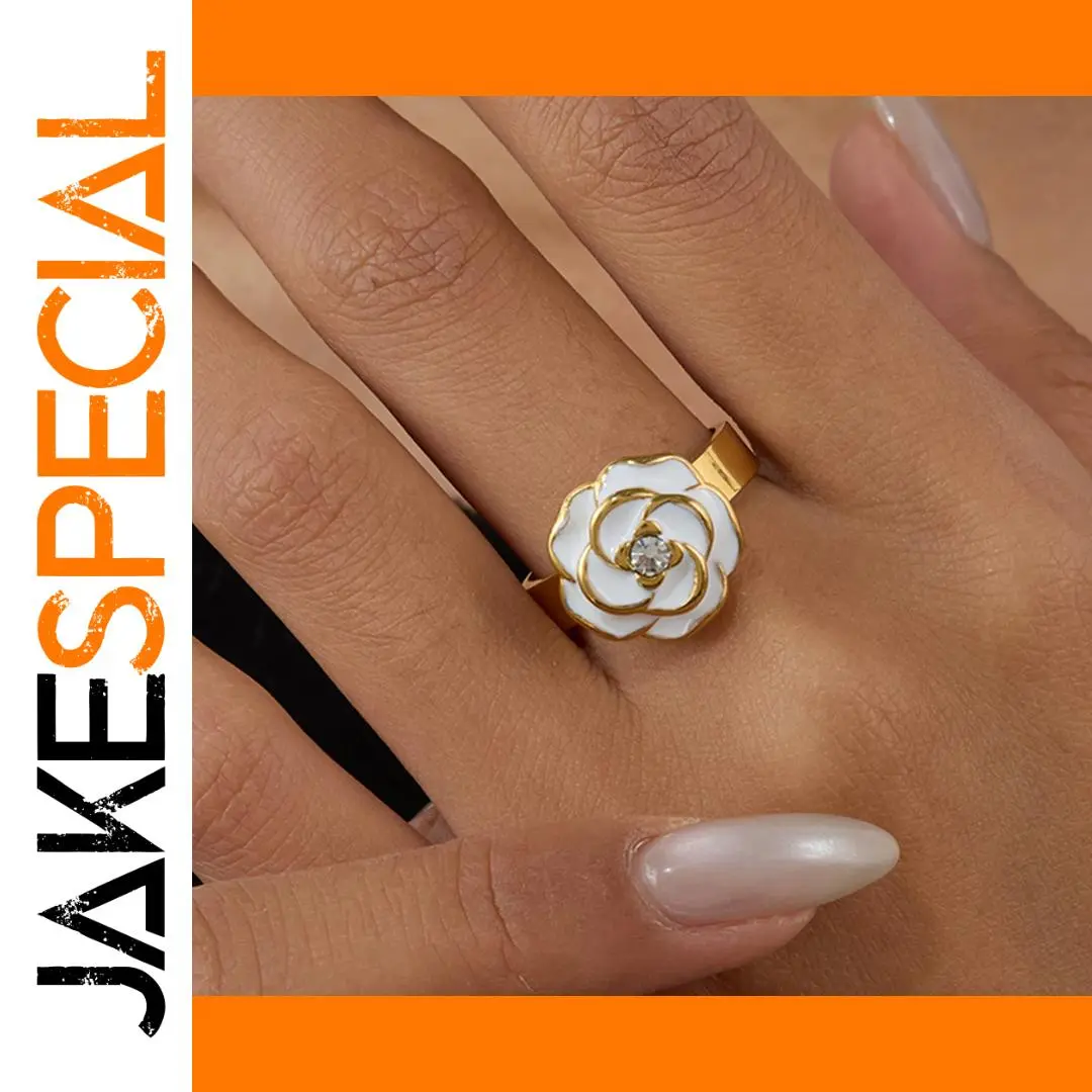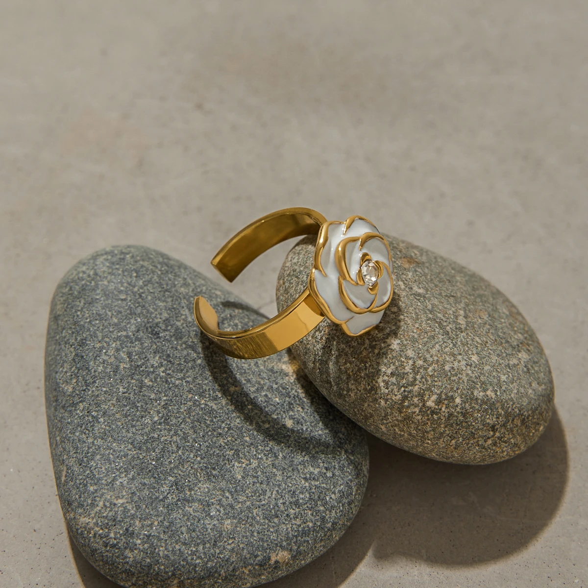 This trendy stainless steel open ring features a 2mm wide gold PVD finish, offering long-lasting color, anti-scratch, and waterproof durability. Weighing approximately 15 grams, it showcases a delicate drip oil flower motif with a pave setting of sparkling crystal stones in a round shape. Designed to be adjustable, it comfortably fits all finger sizes and is perfect for fashionable occasions or parties. Crafted with a modern, eye-catching aesthetic, this jewelry piece combines elegance and trendiness, making it a versatile accessory for women seeking chic, durable jewelry for special moments.