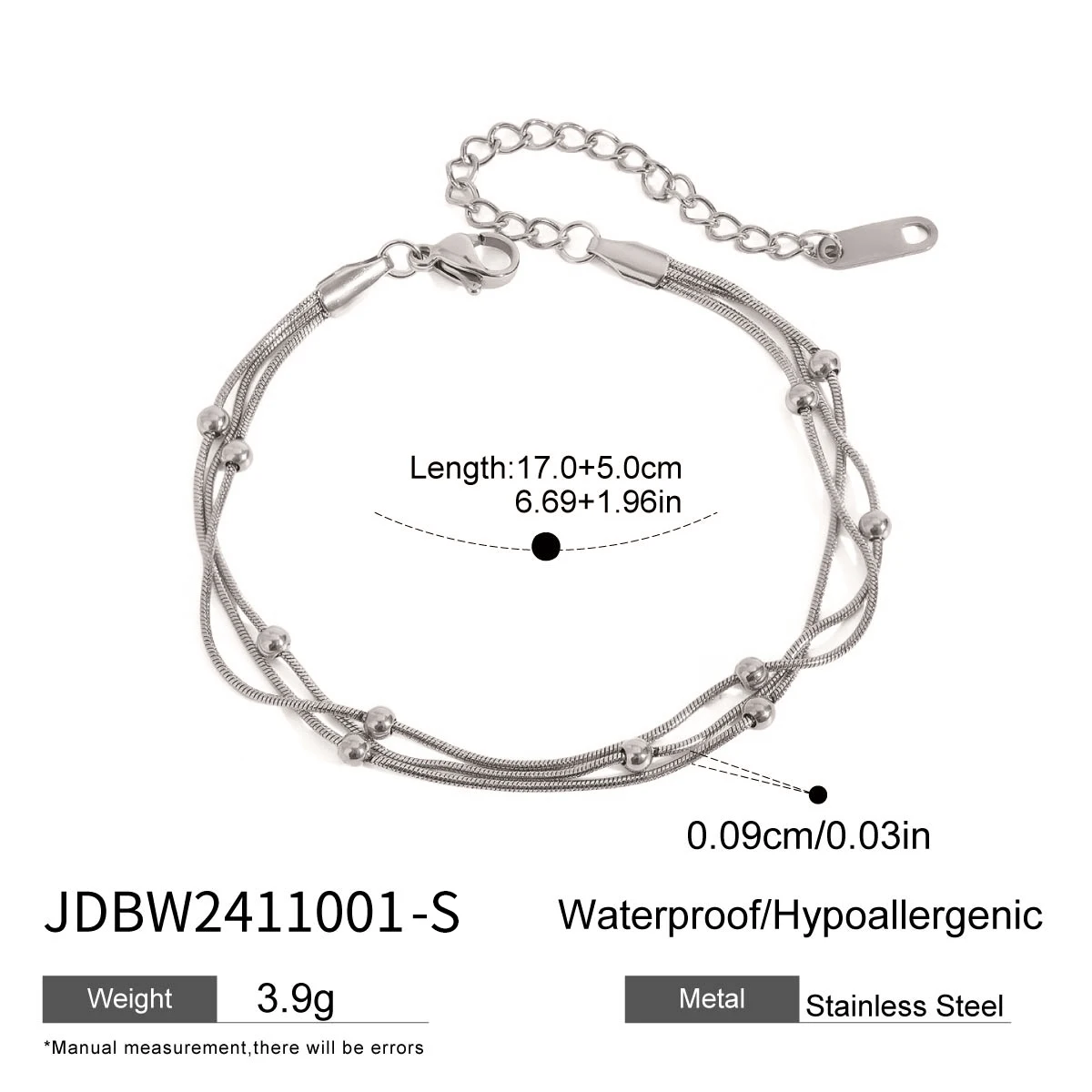 Imagine the subtle shimmer of this delicate gold-colored bracelet gracing your wrist, elevating your everyday style or completing a sophisticated look. Crafted from high-quality stainless steel with a durable PVD gold finish, it offers long-lasting color that resists fading and scratches. The layered, intertwined thin chains create a textured, minimalist aesthetic, while tiny round beads accentuate its refined charm. Lightweight at approximately 15 grams, this bracelet is comfortable for all-day wear. Its adjustable length features a lobster claw clasp for a perfect fit. Versatile and stackable, this accessory exemplifies effortless elegance, making it an essential addition to your jewelry collection, suitable for any occasion and style preference.