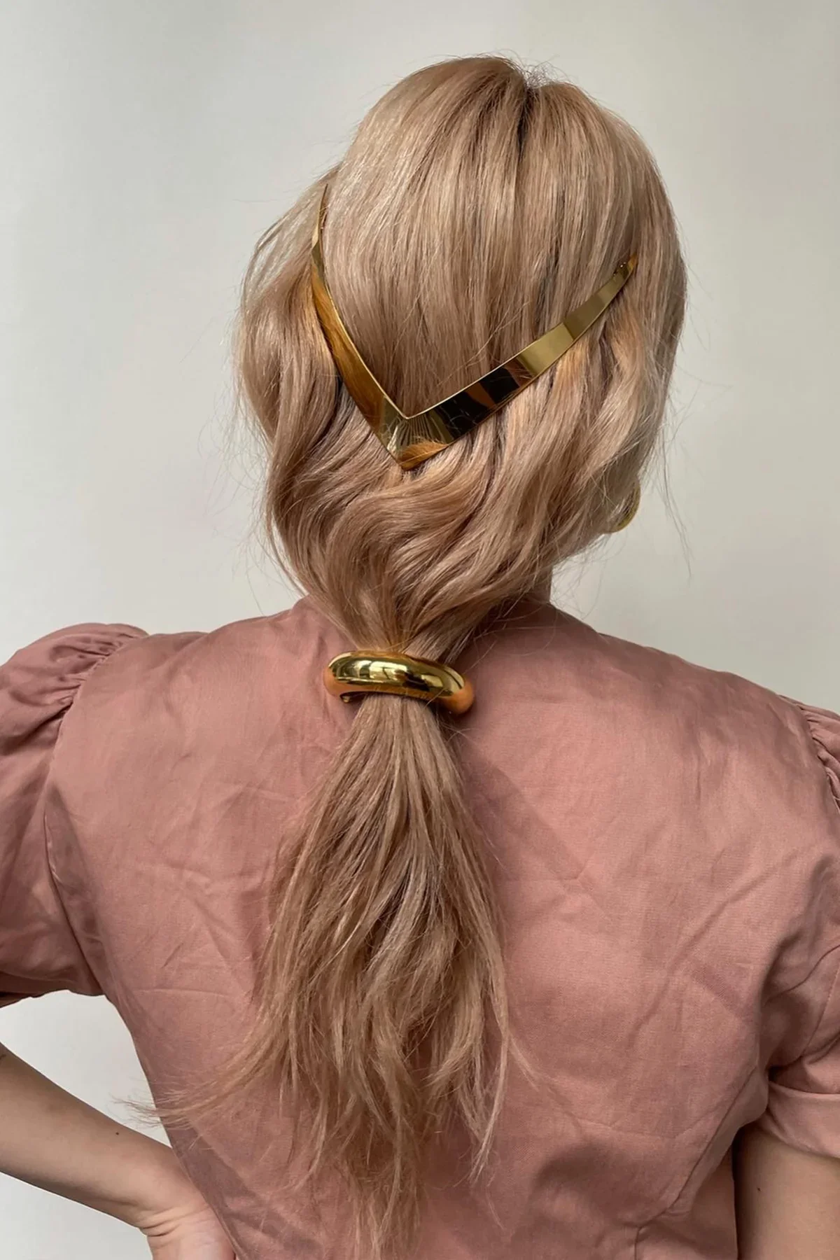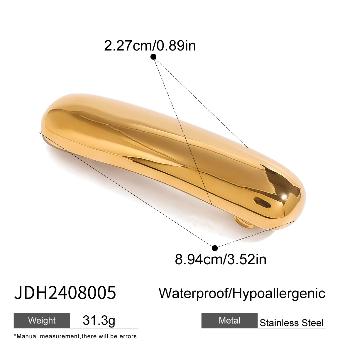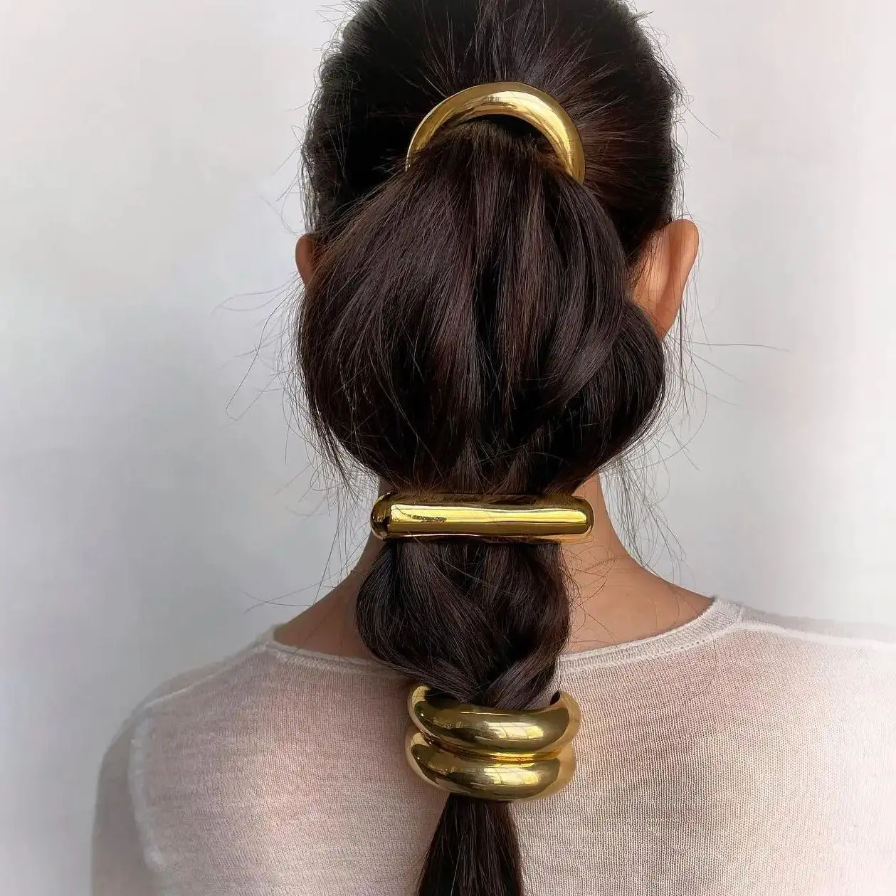 Transform your hairstyle with this luxurious set of hair accessories designed for women seeking a trendy and sophisticated look. Crafted from durable stainless steel with a vibrant PVD gold finish, these pieces resist fading, scratching, and water, ensuring long-lasting shine and elegance. The set includes a variety of forms: large, smooth, rounded hairpins with a chunky, modern appeal; curved cuff-style pieces with a tubular shape for a bold statement; and a sleek, cylindrical bar for minimalist styling. Perfect for adding a luxurious touch to any hairstyle, these accessories elevate your daily or special occasion look with their polished and refined design. Their versatile style compliments casual, professional, or glamorous outfits effortlessly, making them a must-have fashion staple.