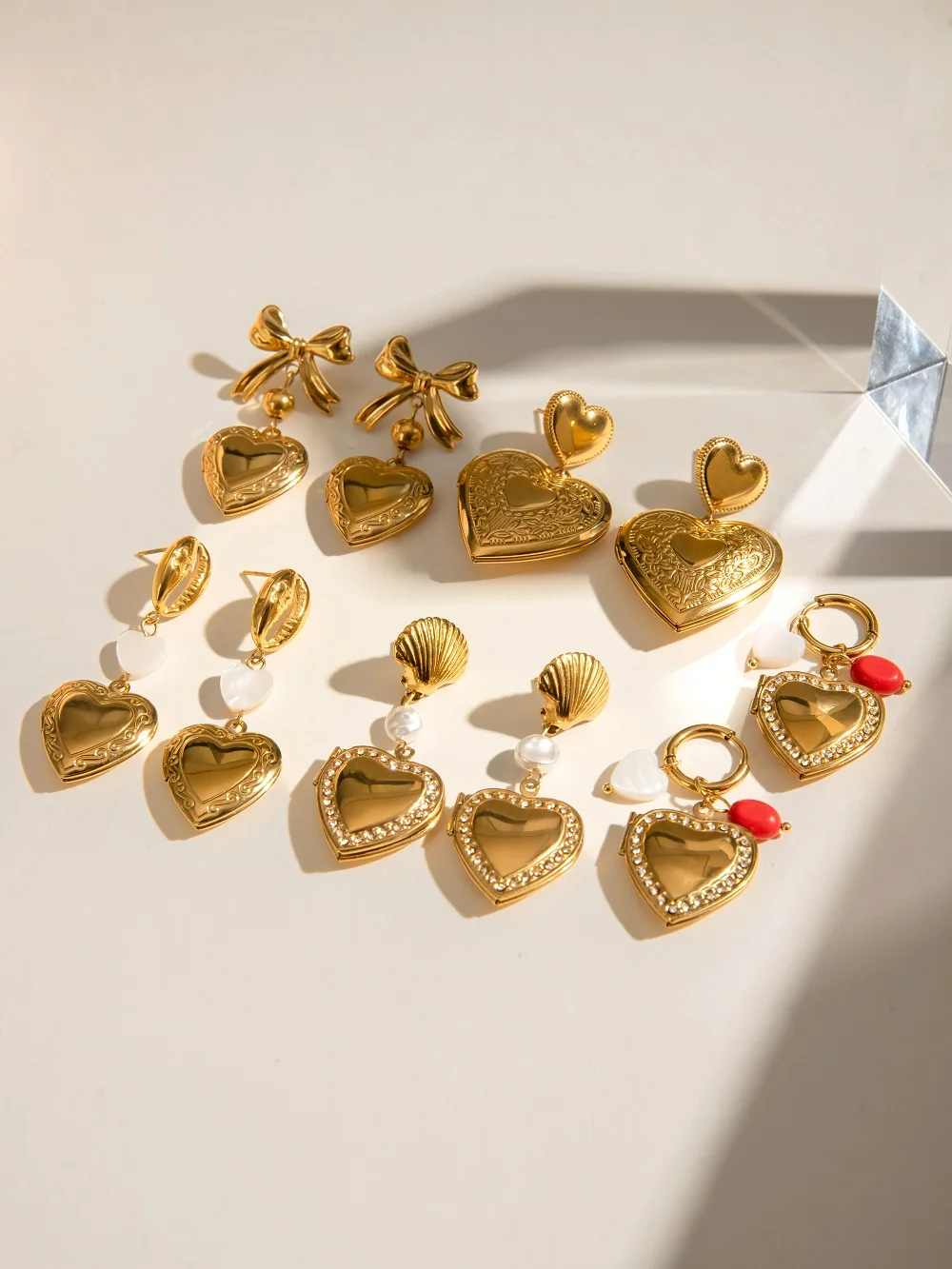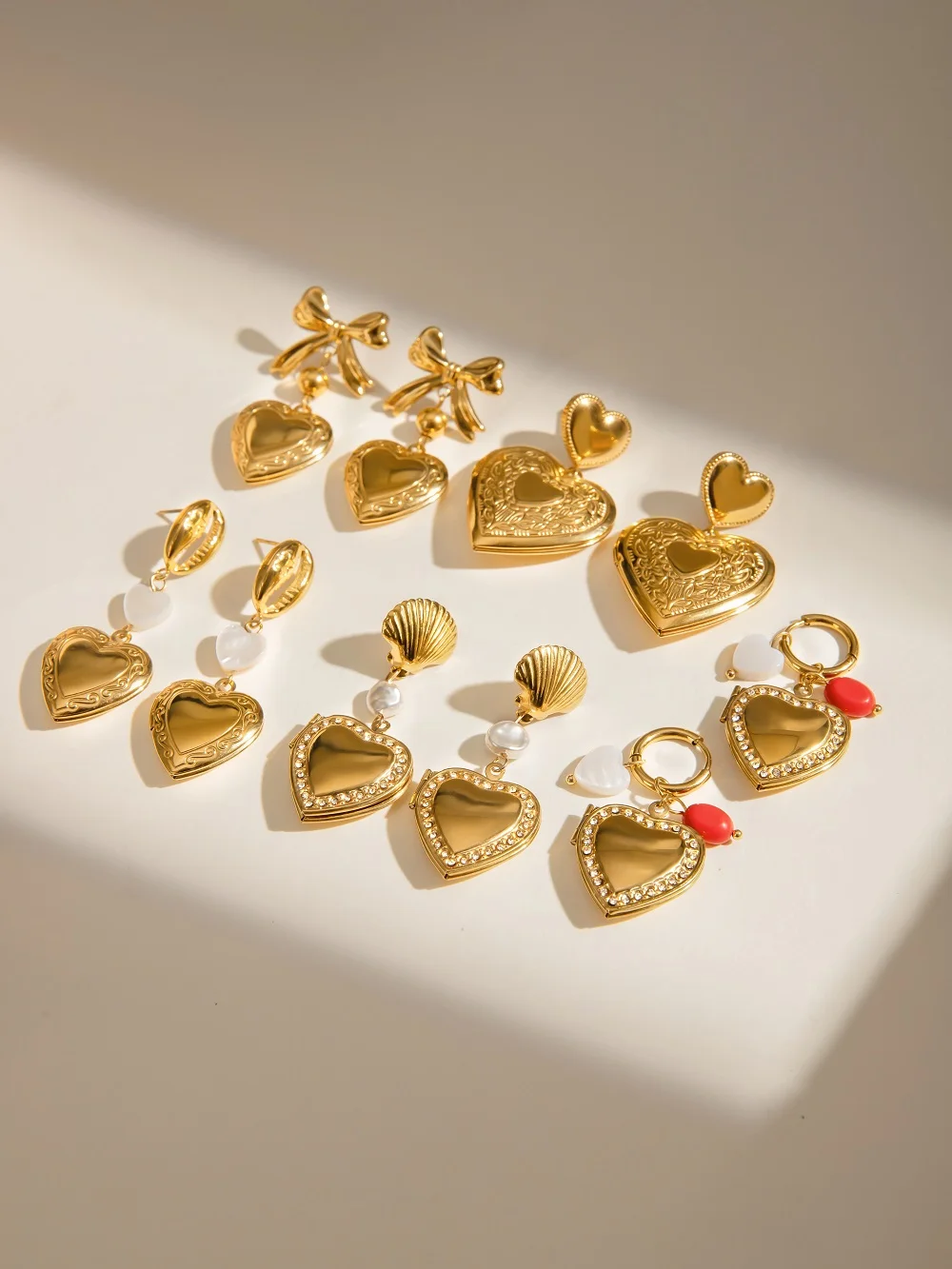 Experience the charm of these beautifully crafted drop earrings, designed to elevate your style effortlessly. Made from durable stainless steel with a PVD gold finish, these earrings resist fading, scratches, and water, ensuring long-lasting brilliance. Featuring a trendy heart-shaped design, some adorned with dazzling white rhinestones, while others showcase chic shell stone pendants, these accessories blend elegance with modern fashion. Varying in size from delicate studs to bold statement pieces, they cater to different looks, perfect for daily wear or special occasions. The shiny, smooth surfaces highlight intricate engraved patterns, adding depth and sophistication. When you wear these earrings, you’ll feel confident and stylish, making every moment special.