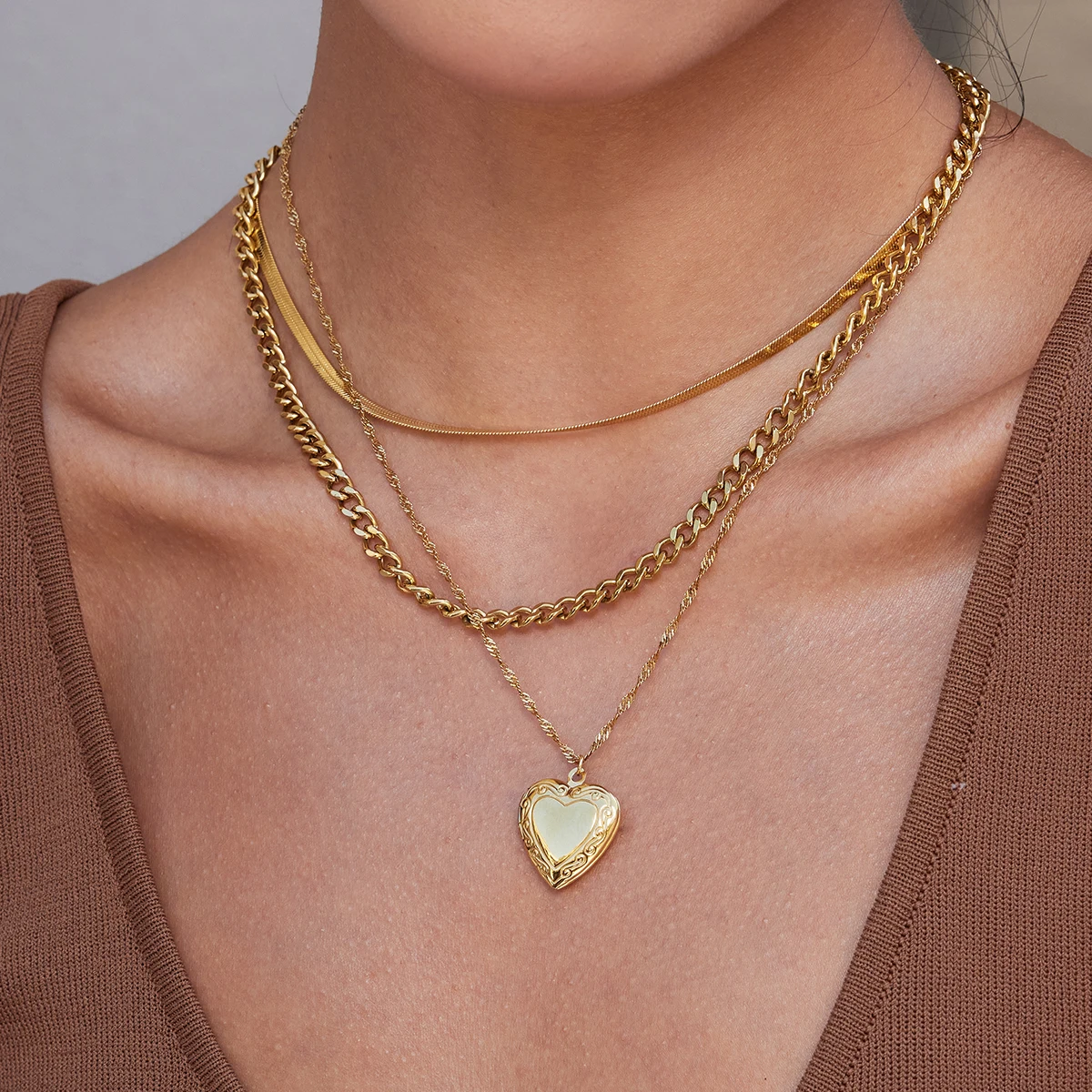 Transform your look with this stunning layered necklace set, designed to add sophistication to any formal occasion. Crafted from durable stainless steel with a luxurious gold-tone finish, this ensemble features a delicate choker-style chain, a finer textured chain, a bold link chain, and a dainty pendant chain with a charming heart-shaped photo box pendant. The 2 cm pendant adorns intricate engravings along its edges and a smooth, shiny center, perfect for holding a treasured photo or keepsake. The versatility of the layered design creates a timeless, elegant aesthetic that complements any skin tone and outfit. Whether celebrating special moments or elevating everyday elegance, this necklace promises to be a treasured addition to your jewelry collection.