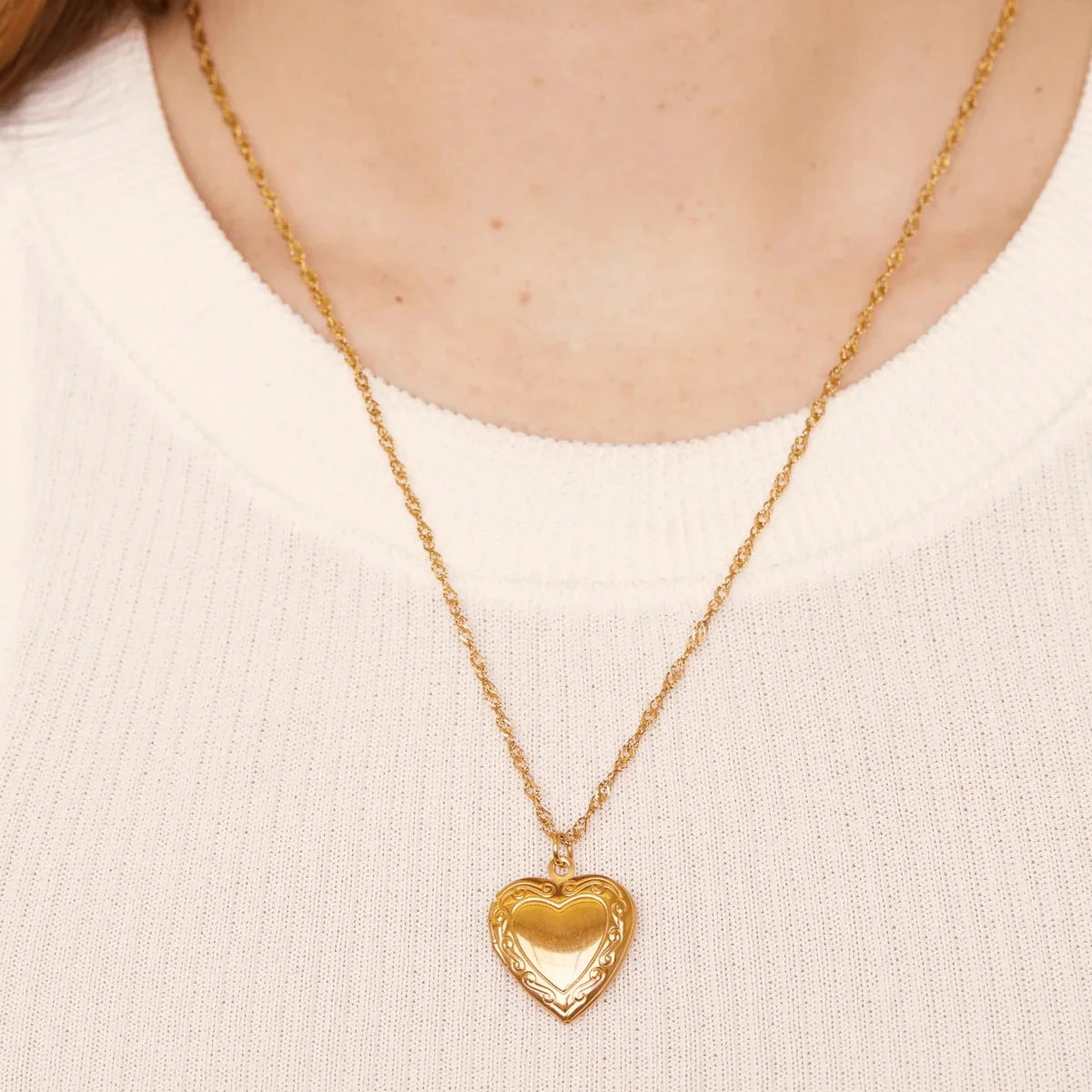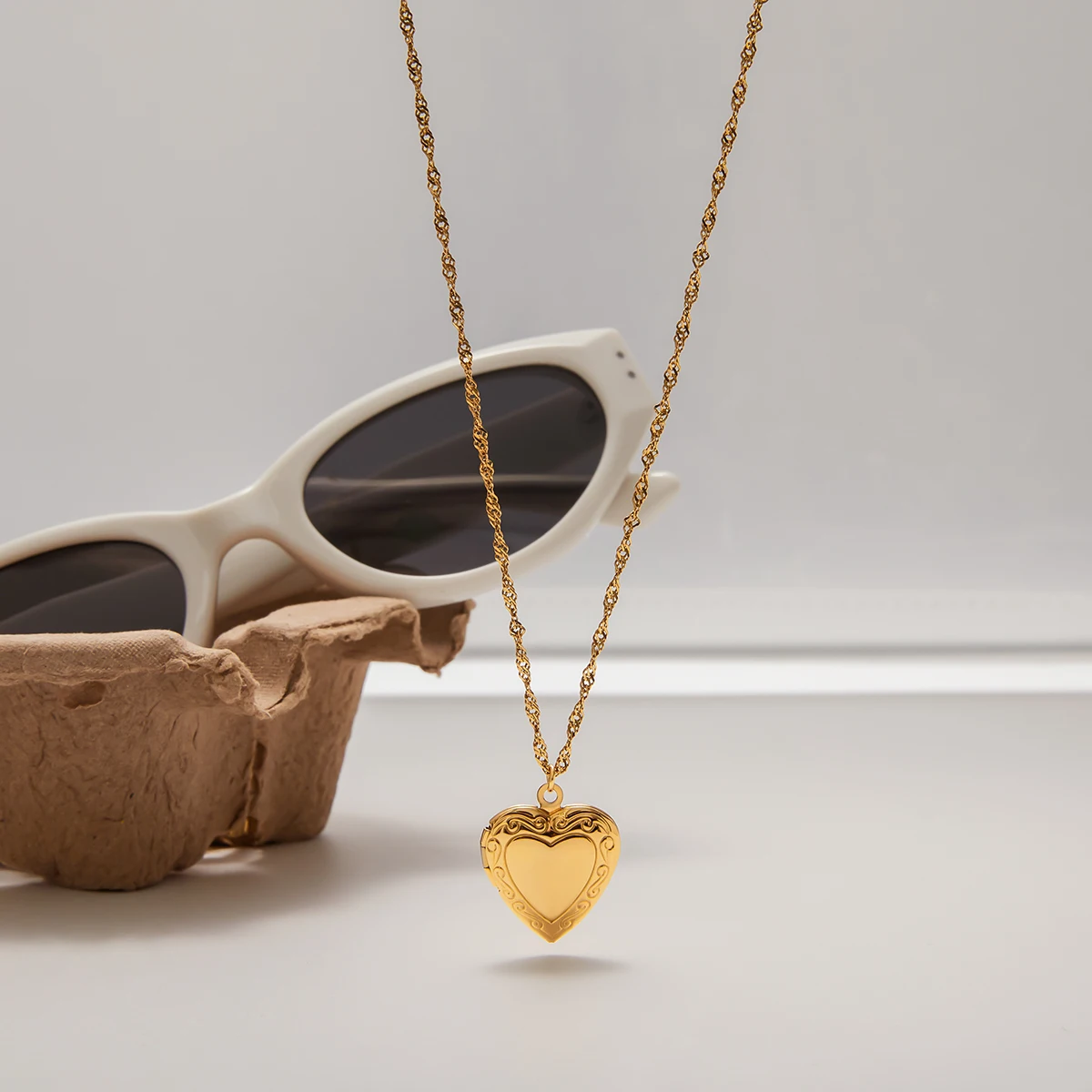 - This necklace features a heart-shaped photo box pendant, measuring 2 cm, with an ornate, engraved edge and a smooth, reflective gold surface, perfect for personal keepsakes or miniature photos.