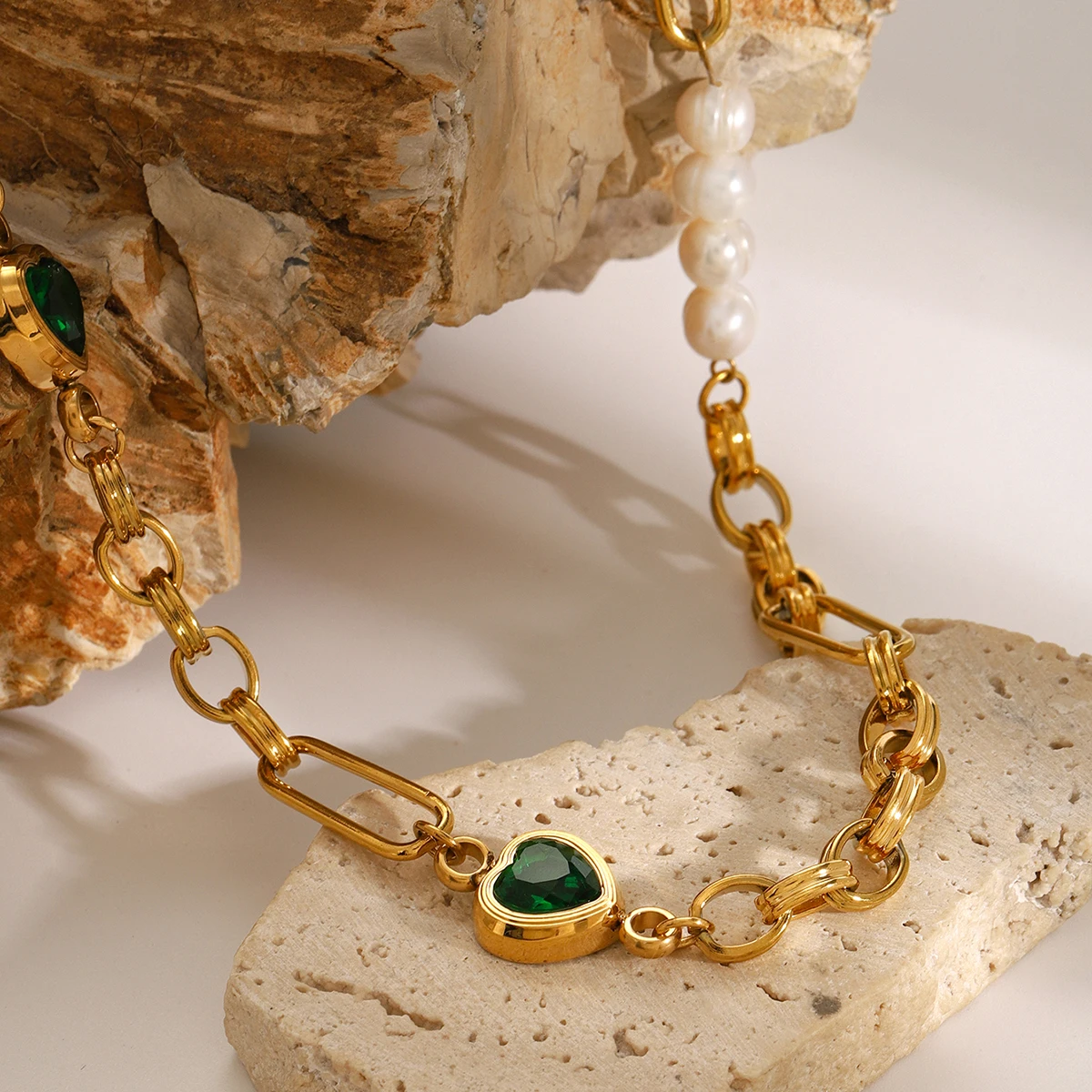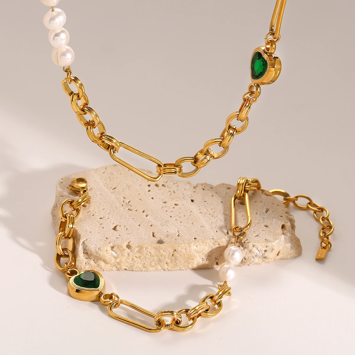 Experience timeless elegance with this high-grade stainless steel jewelry set, finished in a vibrant gold-tone that is waterproof, durable, and anti-allergic. The set includes a Figaro chain necklace adorned with lustrous freshwater pearls and three charming green heart-shaped gemstones, complemented by a matching bracelet featuring similar chain links, three green gemstones in gold-tone bezels, and freshwater pearl accents. Both pieces are equipped with adjustable clasps for a perfect, comfortable fit, making them ideal for daily wear or special occasions. Designed to enhance femininity, style, and sophistication, this set seamlessly blends modern trends with classic beauty, elevating any outfit with effortless grace.