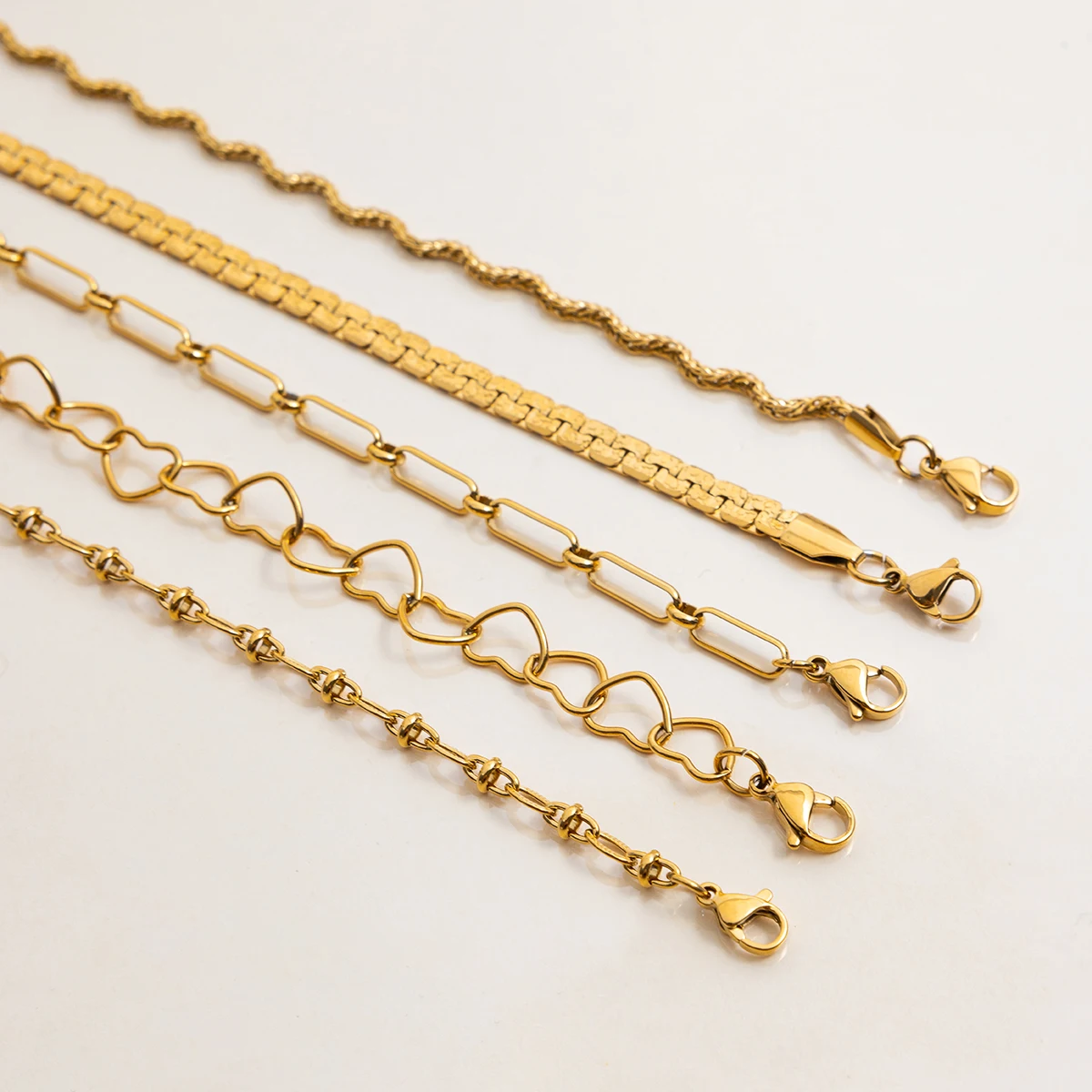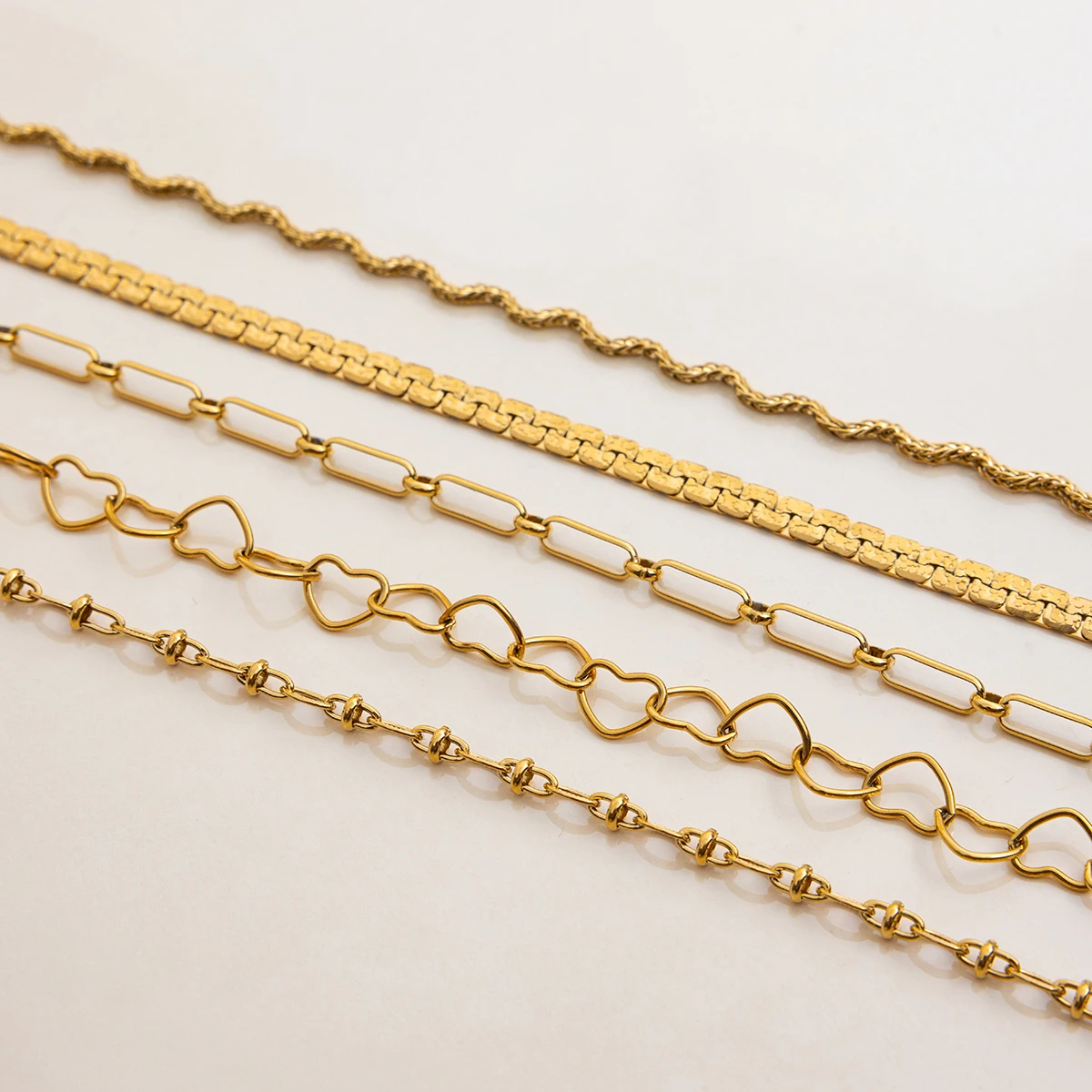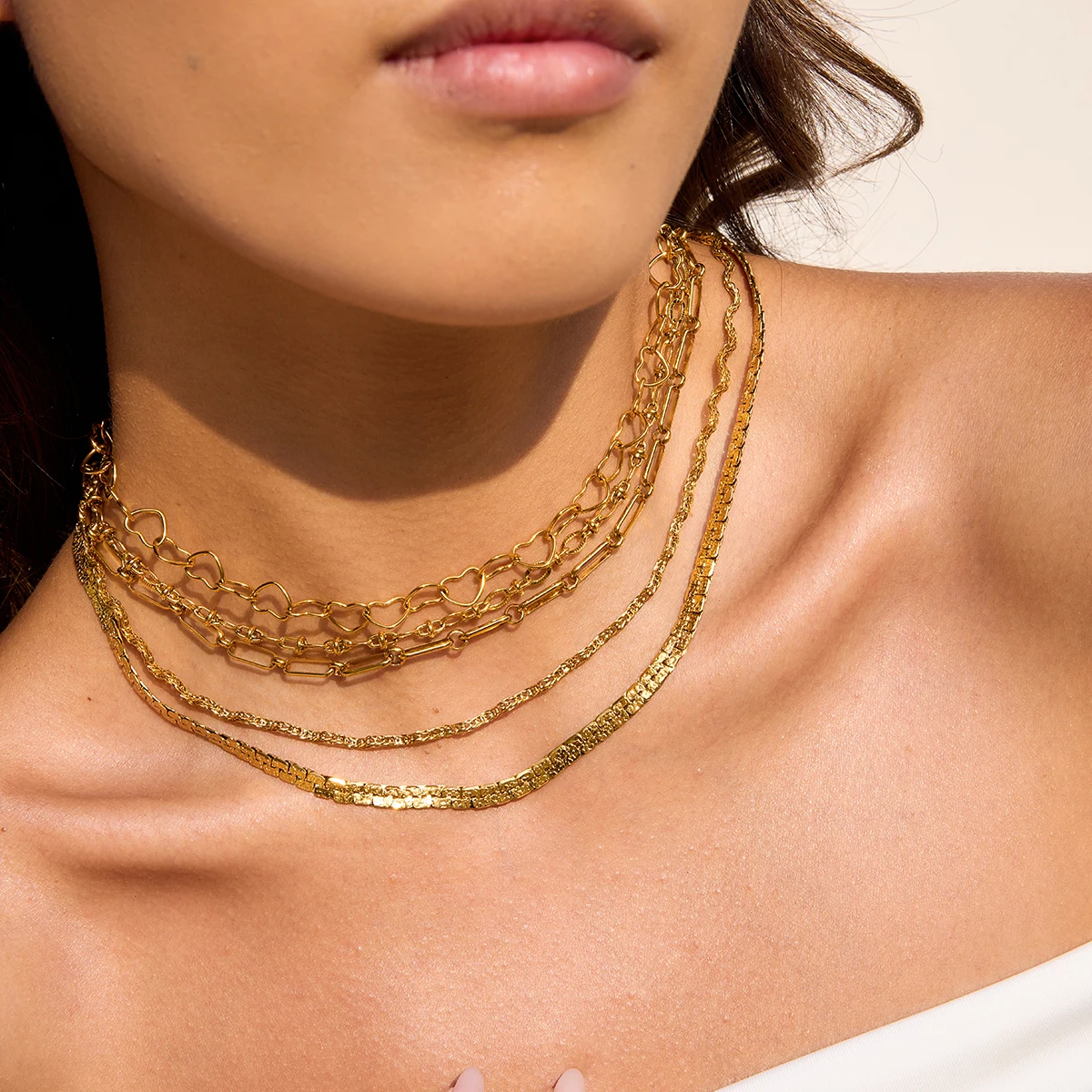 Immerse yourself in the charm of this beautifully crafted layered necklace set, designed to elevate your style effortlessly. Made from high-quality stainless steel, it showcases a warm, retro sand gold matte finish that adds vintage appeal. The necklace features four distinct chains, each with a unique design that combines elegance and modernity. From the delicate tiny-link chain to the bold flat link, every piece drapes smoothly over your skin, highlighting craftsmanship and style. The centerpiece, a hollow heart-shaped pendant with a softly rounded edge, adds a romantic touch perfect for party occasions or stylish outings. This versatile necklace invites you to embrace a fashionable look that is both classic and contemporary, making it an essential accessory to cherish.