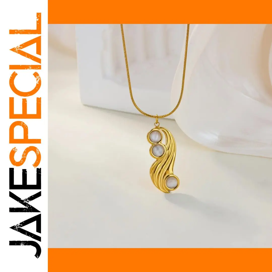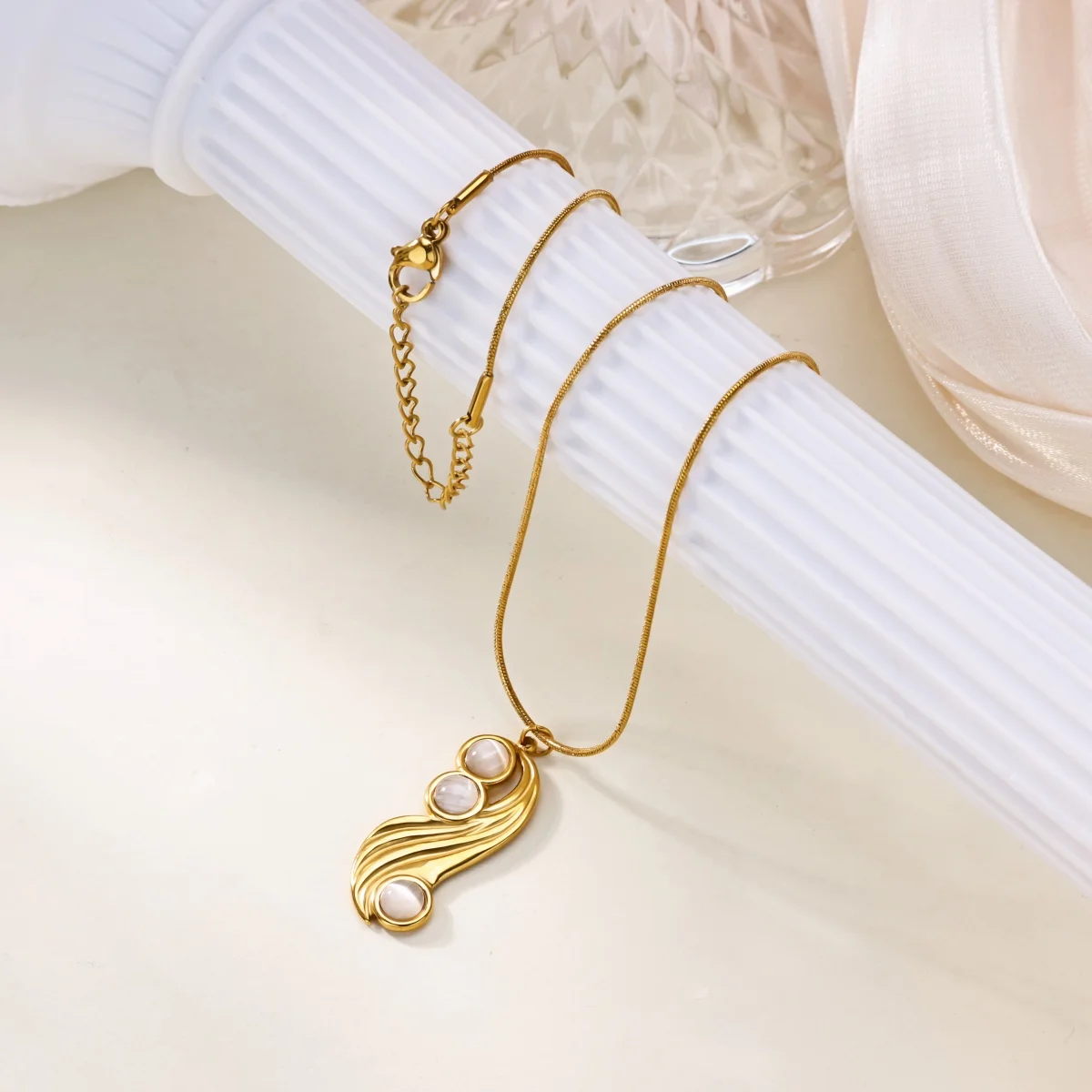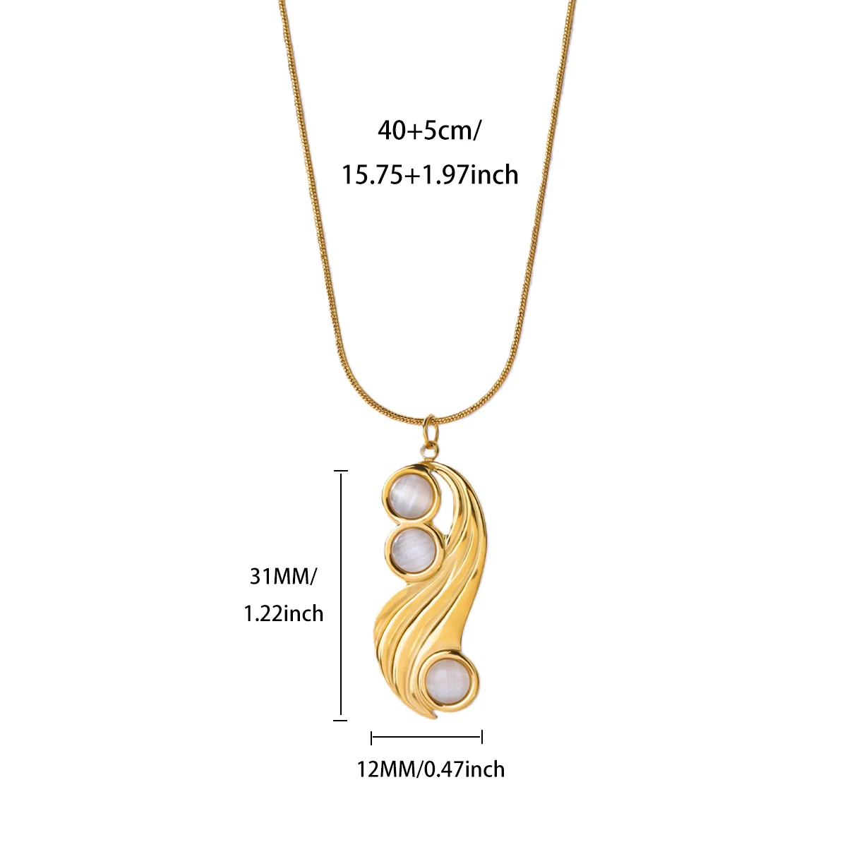 Imagine adding a touch of sophistication to your everyday or special occasion outfits with this stunning gold stainless steel necklace. Its sleek, polished chain creates a modern frame for the unique geometric pendant, which boasts flowing, wavy lines reminiscent of a feather or wave, exuding both elegance and contemporary style. Embedded within the pendant are three lustrous, pearl-like beads framed with delicate gold borders, harmoniously arranged to enhance its balanced, luxurious look. Whether you're dressing for a wedding, a formal event, or simply elevating your daily style, this necklace offers versatility, comfort, and a subtle statement of refinement that complements any wardrobe effortlessly.