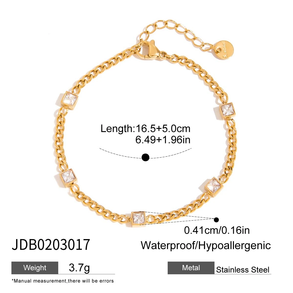 Add a touch of sophistication to your jewelry collection with this beautifully crafted gold stainless steel chain bracelet. Its delicate, lightweight design features interlinked oval-shaped links forming a classic chain silhouette. Small square bezel settings are evenly spaced along the chain, each holding a shimmering white zircon stone set with pave technique, adding a radiant sparkle. The lustrous gold finish enhances its luxurious appeal, making it perfect for daily wear or special occasions. Securely closed with a lobster claw clasp, this versatile piece is ideal for stacking or wearing alone. Its modern, trendy style ensures it complements various outfits, elevating your personal style effortlessly and confidently.