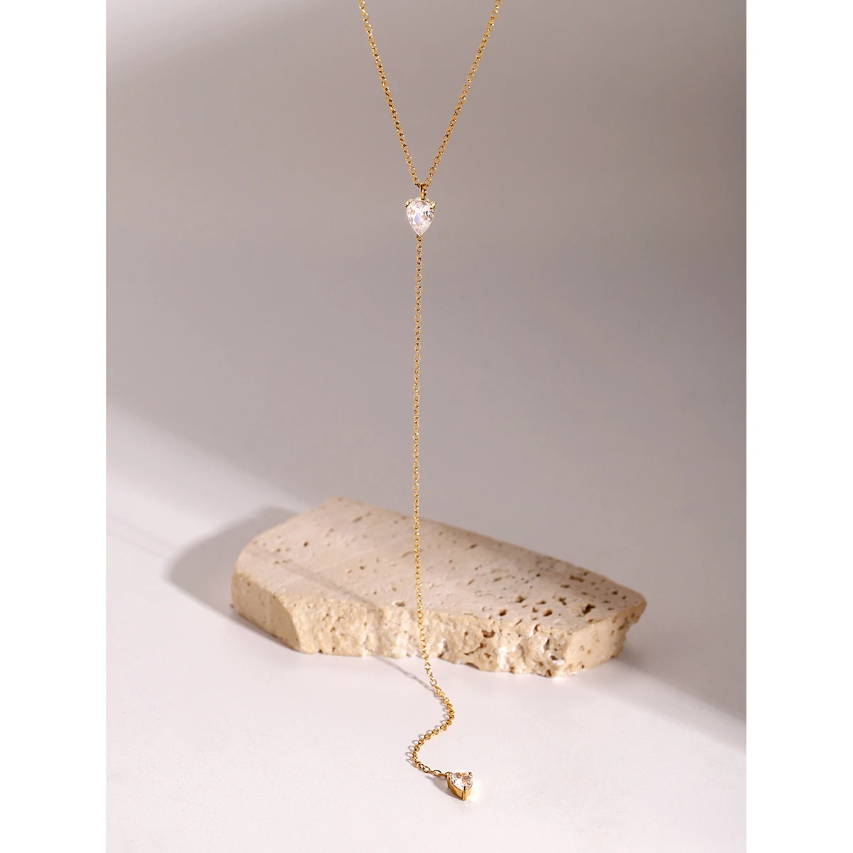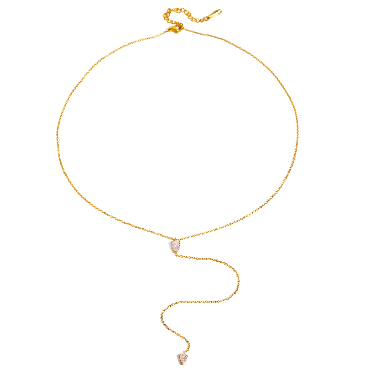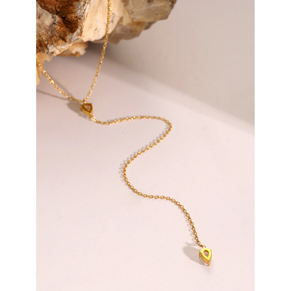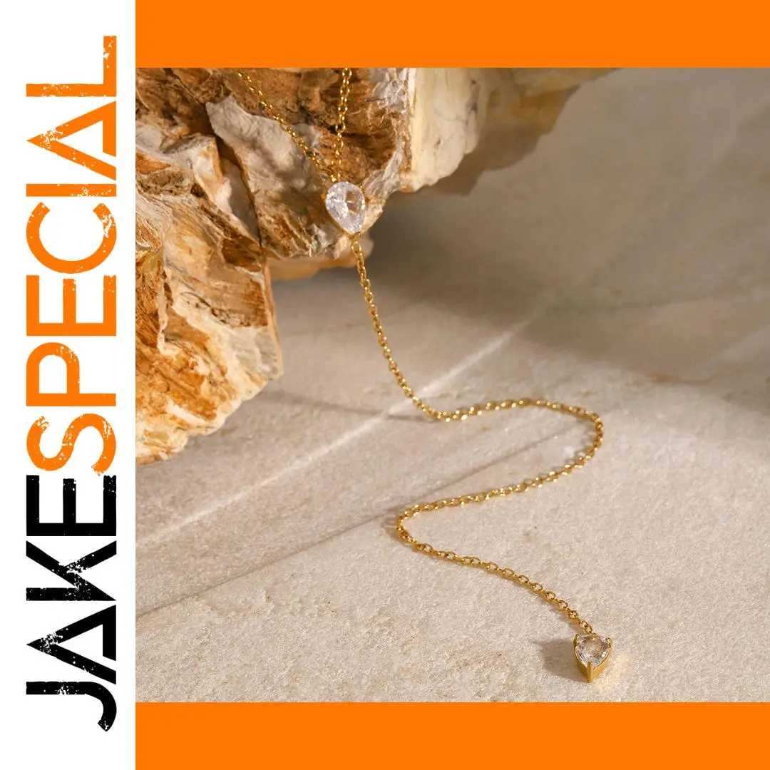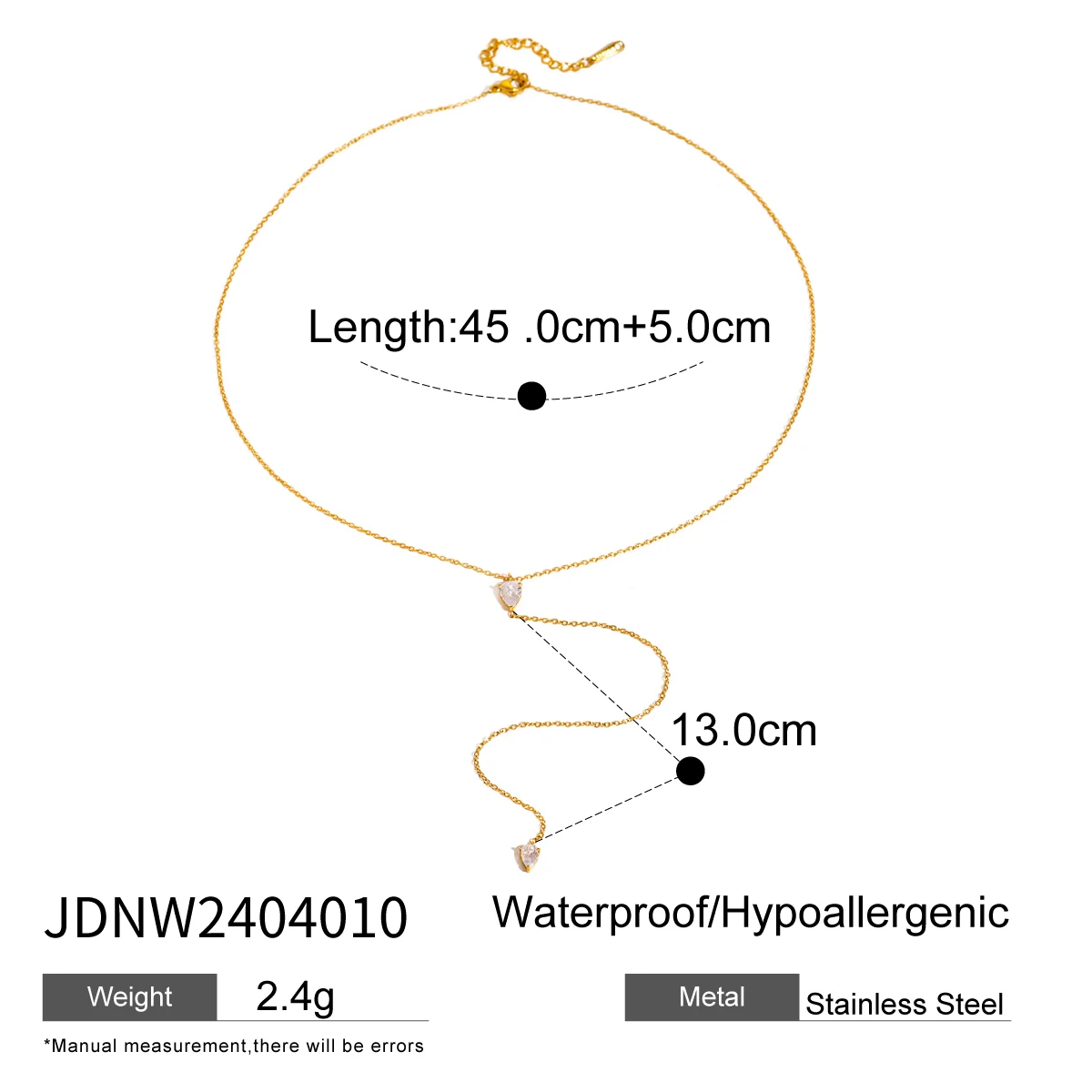 - Technical specifications include: stainless steel base material, PVD gold coating for durability, 15 grams weight, chain length approximately 45 cm, gemstone size around 3 mm.