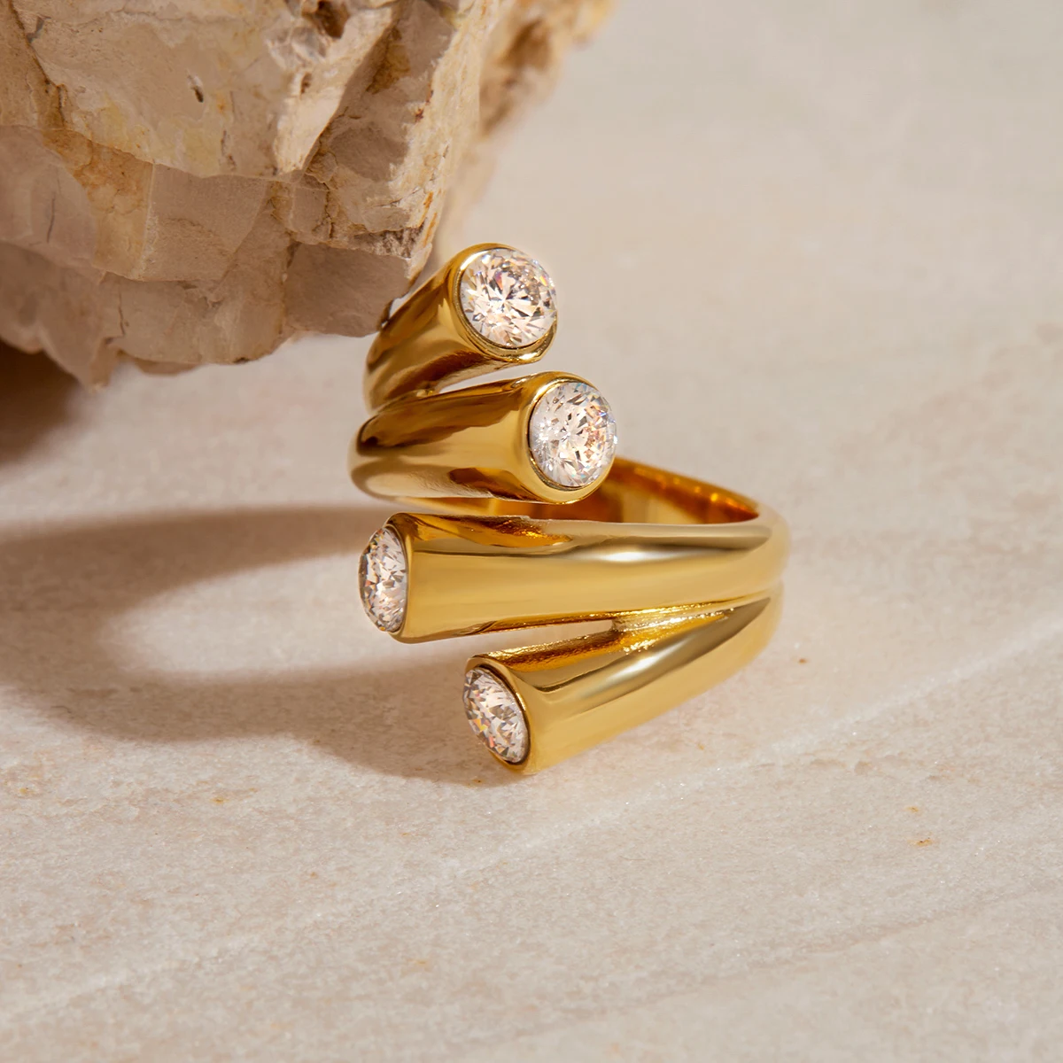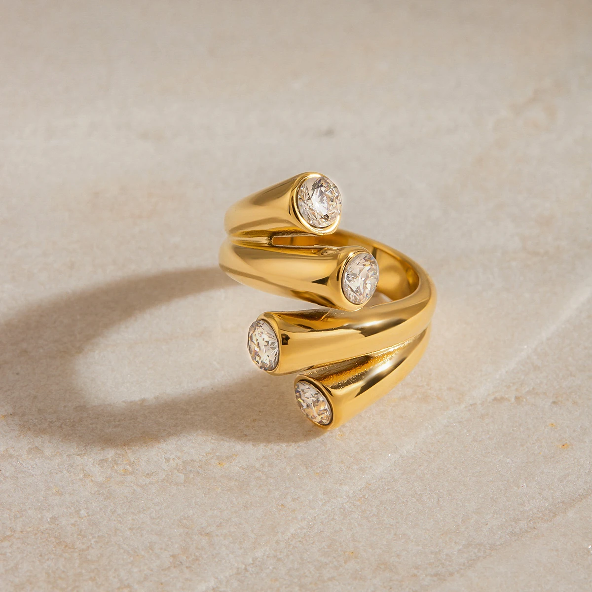 Elevate your accessory collection with this stunning, trendy ring. Its durable design and eye-catching geometric style make it perfect for any occasion. Whether you're dressing up for a party or adding a fashionable touch to casual wear, this versatile piece will enhance your look effortlessly. Its adjustable nature guarantees a perfect fit, making it an ideal gift for someone special or a treat for yourself. Invest in a jewelry piece that combines modern aesthetics with durability and comfort. Experience the elegance of stainless steel with a chic gold finish—don’t miss out on owning this contemporary masterpiece.