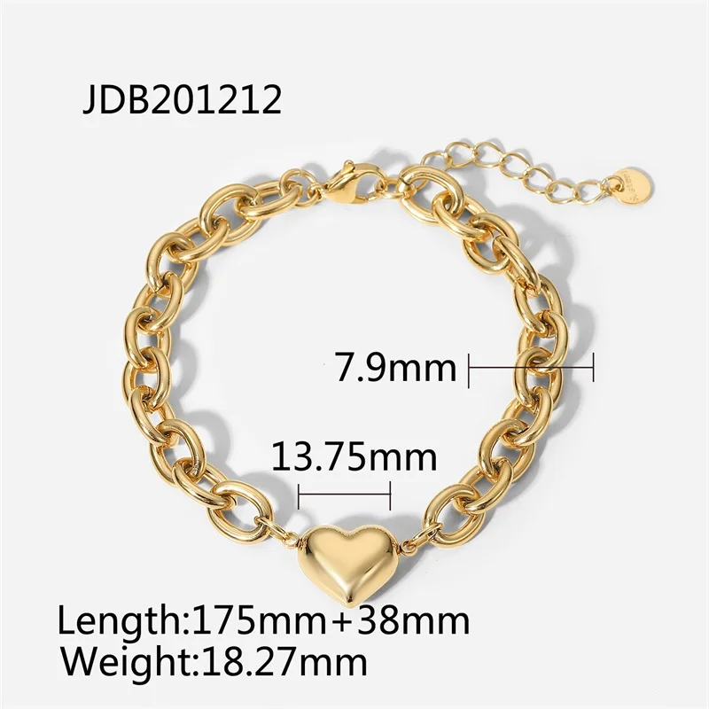 Enhance your elegance with this polished stainless steel women’s bracelet featuring a luxurious gold-tone finish. The flexible round-link chain offers a comfortable fit, adjustable via a short chain with small oval links and a secure lobster clasp. At the center lies a sleek, three-dimensional heart-shaped pendant with a glossy, reflective surface, adding a romantic touch. The bracelet also includes a subtle brand charm at the end of the extension chain, making it a versatile accessory for both formal occasions and everyday wear. Its timeless design and adjustable fit ensure it will become a cherished piece in your jewelry collection, perfect for expressing your unique style.