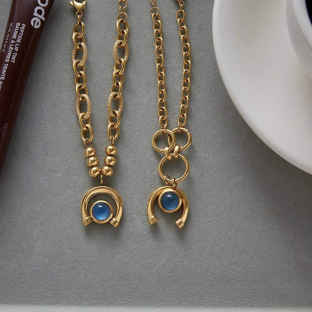 Step into sophistication with this stunning jewelry set, crafted in a luxurious gold-tone finish that instantly elevates your style. The bracelet features large, polished, rounded beads intertwined with textured links, creating a beautiful contrast between smooth and intricate surfaces. Its stainless steel construction ensures durability and a comfortable fit, secured with a practical lobster claw clasp and an adjustable chain extender. The coordinating necklace is designed with linked rings, some with sleek, smooth gold finishes, and others with detailed textured surfaces, embodying a modern geometric and celestial motif. Adorned with charming celestial charms—a crescent moon and a circular element with a vibrant blue cabochon gemstone—this set combines elegance with playful color accents. The overall look is layered, dynamic, and perfect for any occasion, enhancing your wardrobe with a touch of luxury.