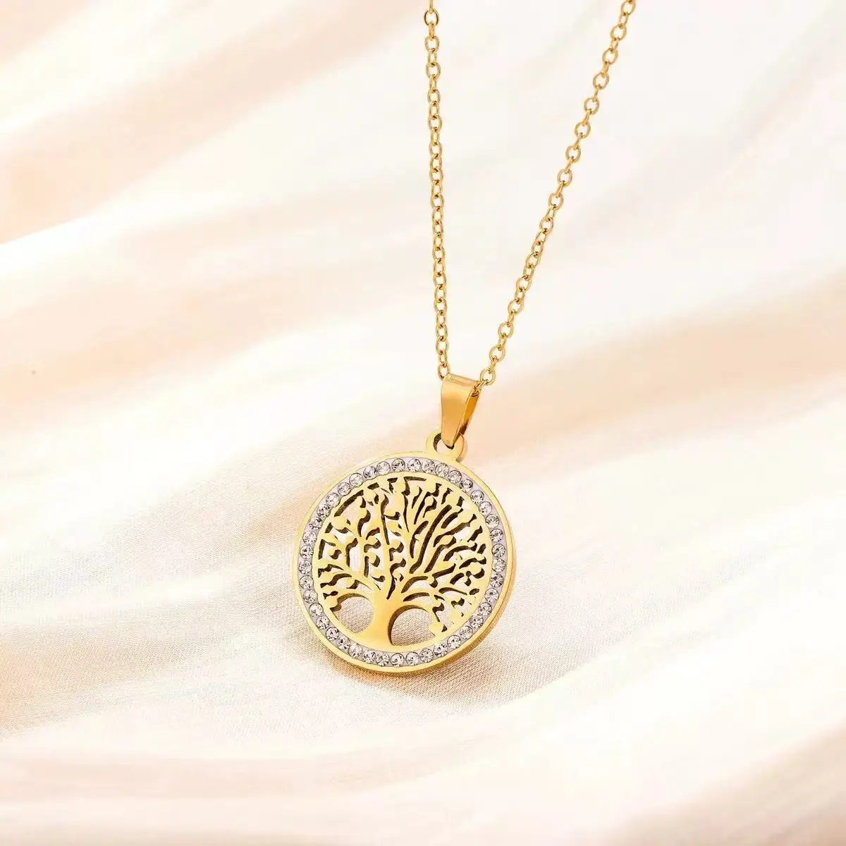 - This necklace features a classic round tree silhouette pendant, symbolizing life, growth, and harmony, finished in a shining gold tone for a luxurious appearance suitable for all occasions.