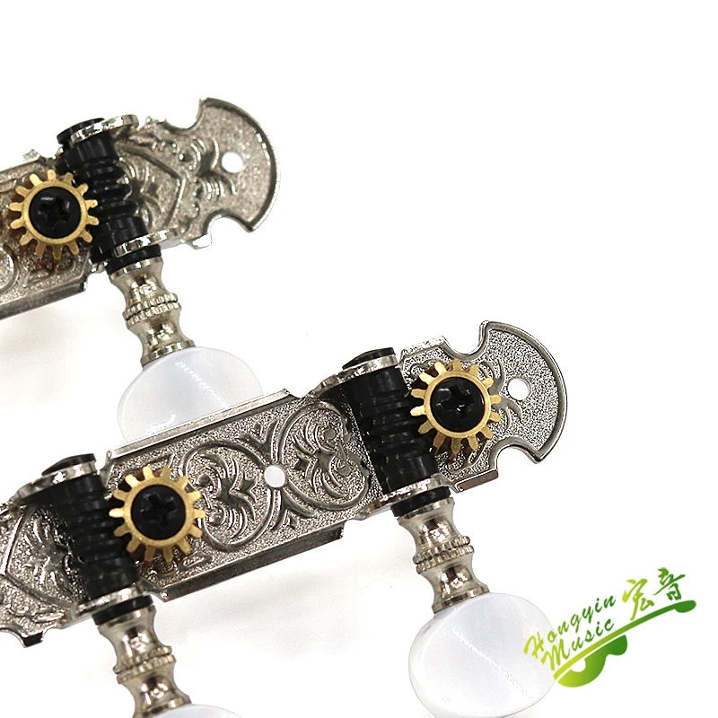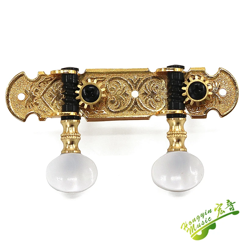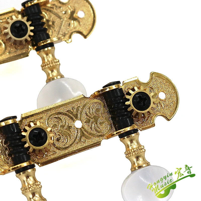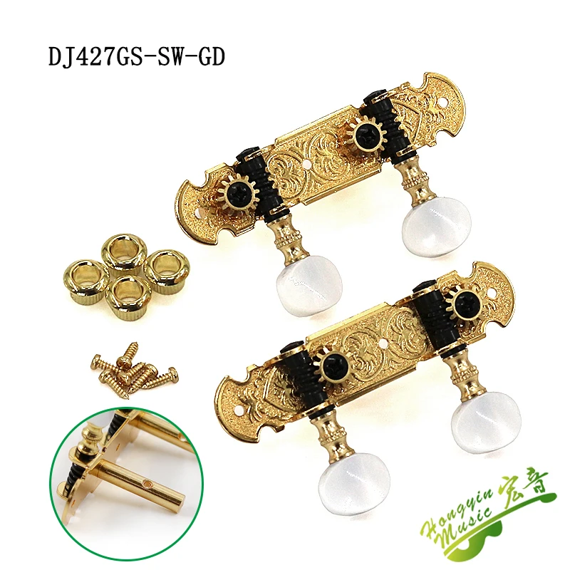 Experience the perfect blend of style and functionality with this set of DJ427N-SW ukulele tuning pegs. Crafted with meticulous attention to detail, these tuning machines feature an ornate, embossed design with intricate scrollwork and floral motifs on their metallic bases, finished in a radiant high-gloss gold hue. The round white knobs offer smooth and comfortable handling, contrasting beautifully with the shiny gold. Designed to provide precise tuning, they boast a gear ratio of 1:14, ensuring each handle rotation translates into 14 turns of the string winding. This set makes an excellent upgrade or replacement, adding a touch of vintage elegance to your ukulele. Durable and easy to install, they promise longevity and a luxurious aesthetic.