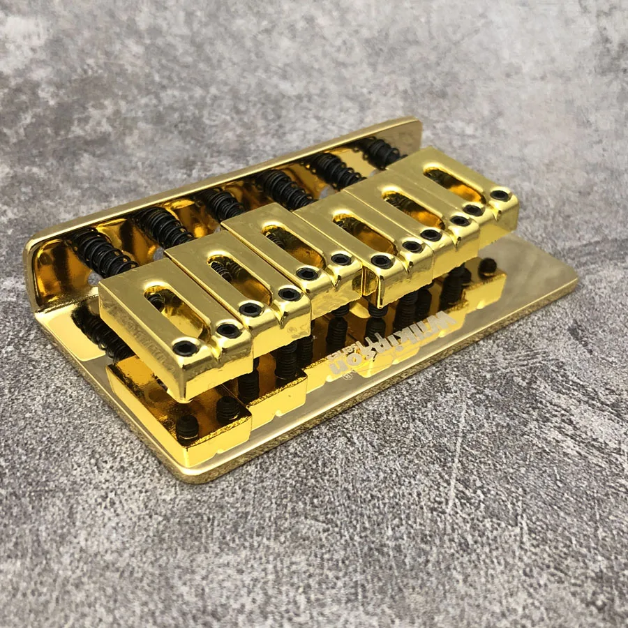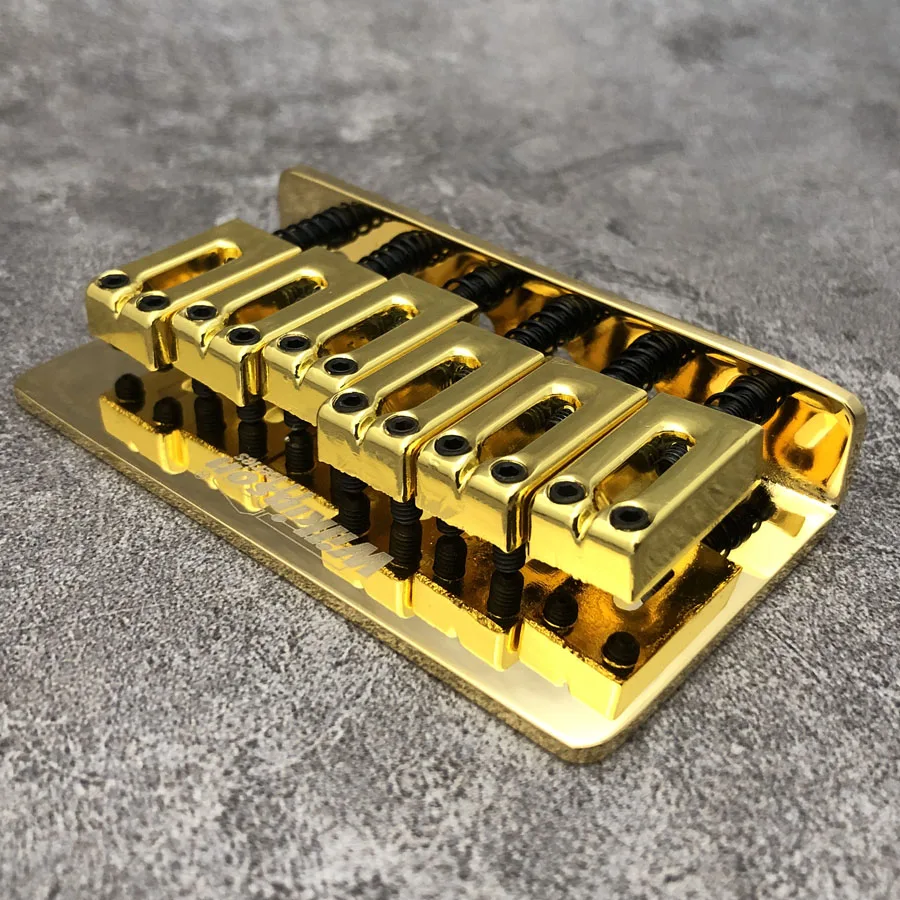 Imagine elevating your guitar’s look and sound with this stunning Wilkinson Guitar Fixed Bridge, model WOF01 GD. Its luminous, highly polished gold finish radiates luxury, catching the light with every movement. Crafted from durable metal, this bridge not only enhances the aesthetic appeal but also ensures precision and stability during performance. The sleek design features adjustable saddles with black screws, providing effortless tuning and intonation adjustments while creating a striking contrast to its shining surface. The rectangular baseplate offers a sturdy foundation, supporting your guitar’s performance with reliability. Whether you’re upgrading an existing guitar or building a custom instrument, this bridge is an excellent choice to combine style and function seamlessly, bringing a touch of sophistication to your musical setup.
